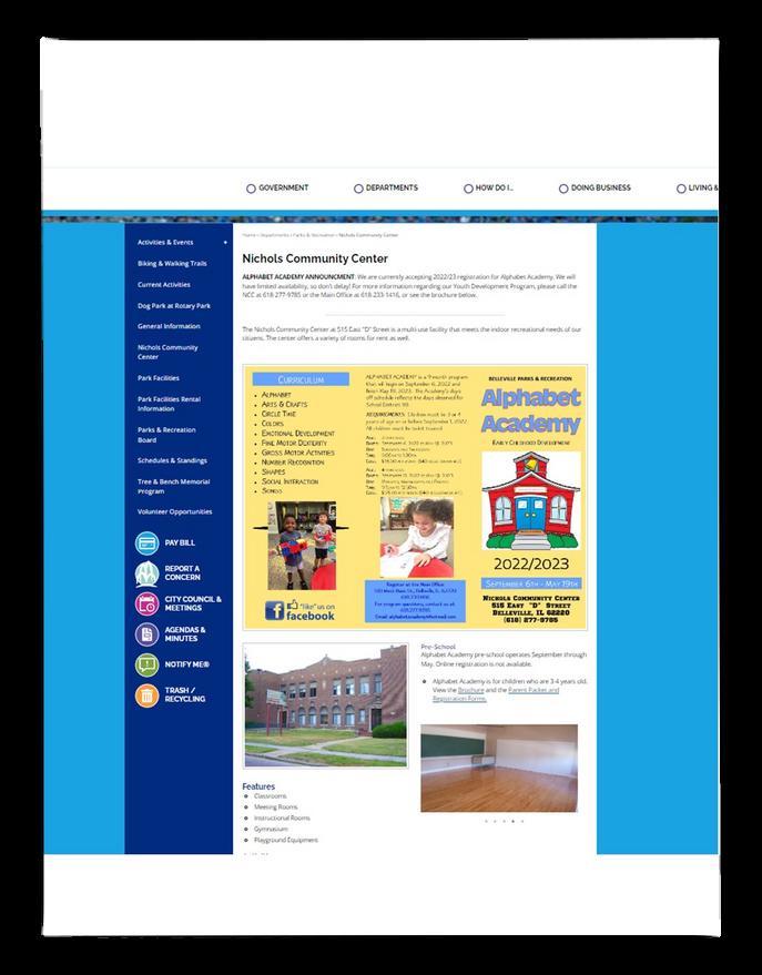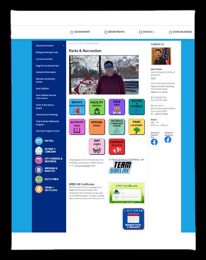 Recreation Coordinator-Athletics: BELLEVILLE parks & recreation Administrative Office 510 W. Main St., Belleville, IL, 62220 618.233.1416 parksnrec@belleville.net Nichols Community Center 515 E. D St., Belleville, IL, 62220 618.277.9785 ncc@belleville.net