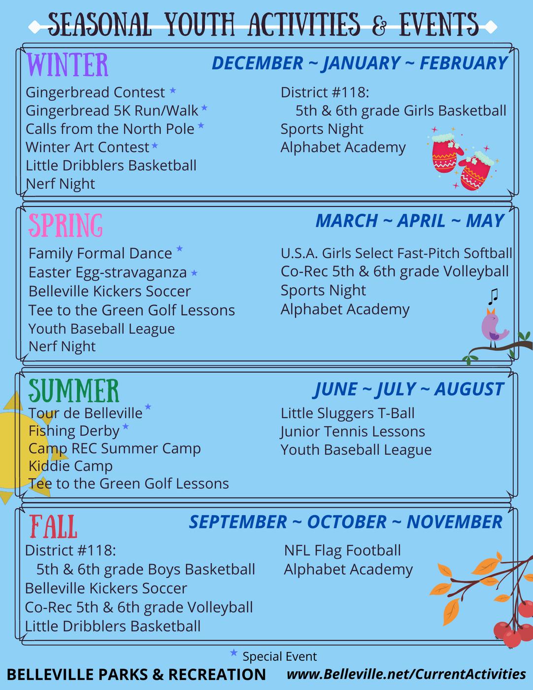 YOUTHBASEBALLLEAGUE AGES5-12THGRADE PAGE 11 BELLEVILLEKICKERSSOCCER AGES3-8THGRADE FROMTHETEETOTHEGREENGOLFLESSONS AGES6-18YEARS YOUTHVOLLEYBALLLEAGUE 5TH&6THGRADES ADULTSOFTBALLLEAGUE MEN'S&CO-RECTEAMS EASTEREGGSTRAVAGANZA AGES8&UNDER FISHINGDERBY AGES4-15YEARS