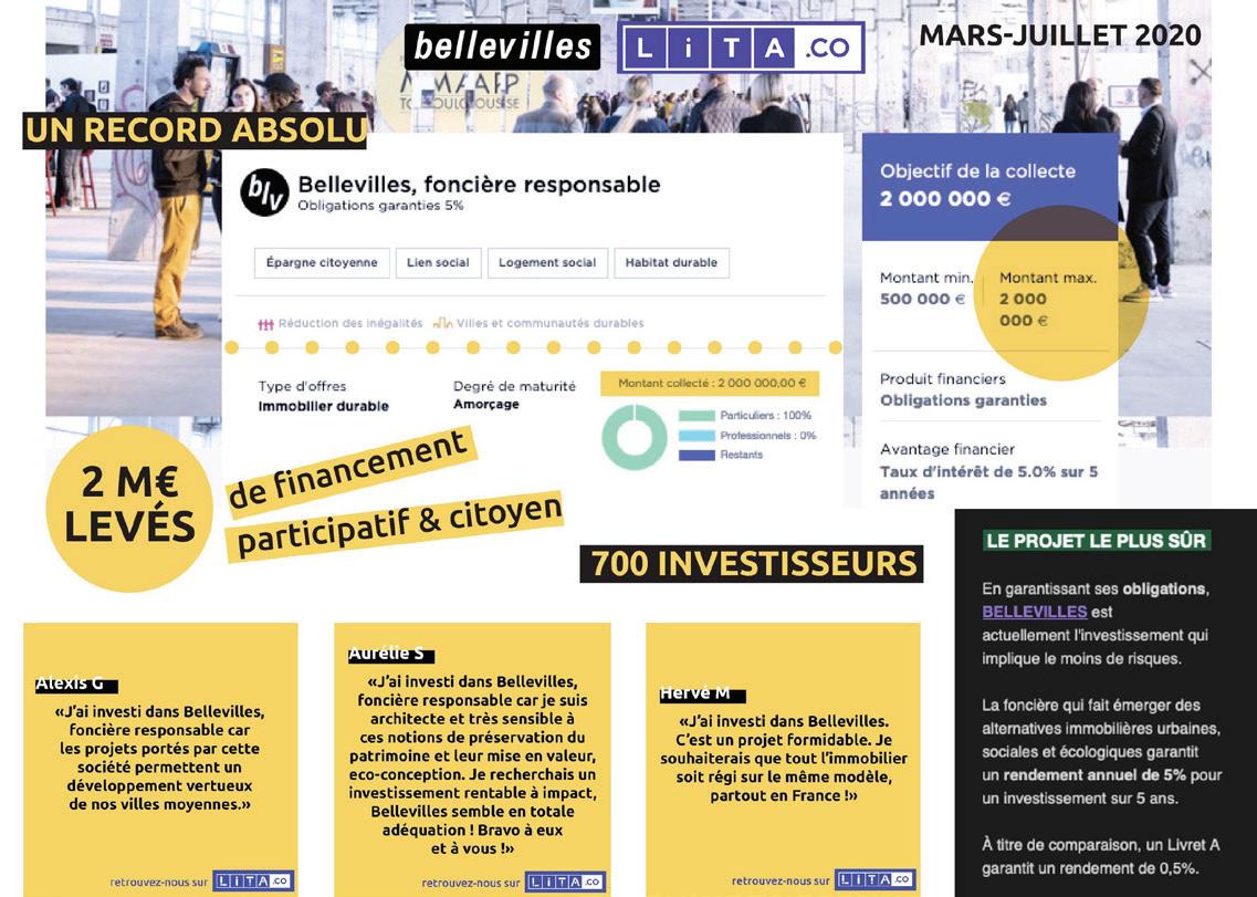 de fonds sur la plateforme de crowdfunding LITA. com. Deux millions d’euros seront collectés sous forme d’obligations auprès de 728 investisseurs citoyens permettant à Bellevilles d’amorcer ses premiers projets et d’expérimenter la finance citoyenne.