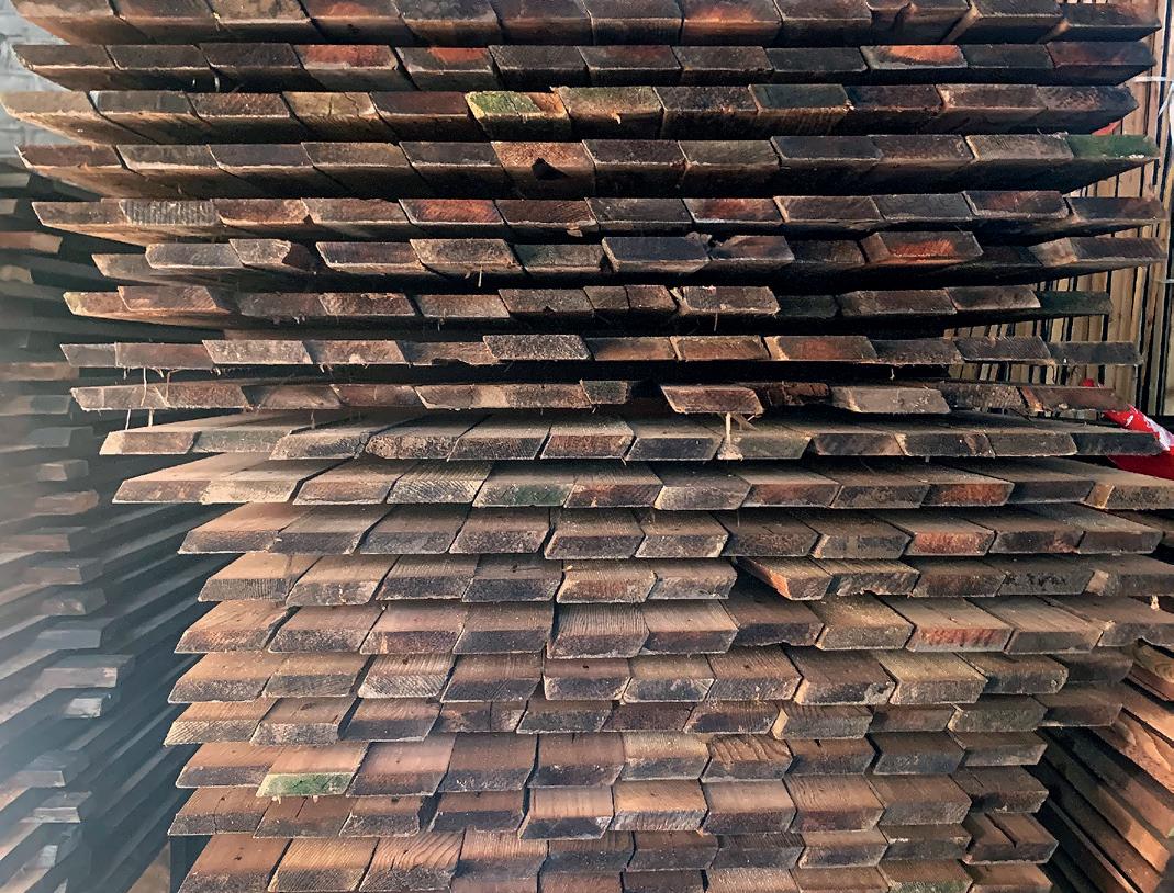 100 % des bardages bois sont en réemploi. Photo du stockage sur le chantier, provenant d'un gisement de Réavie