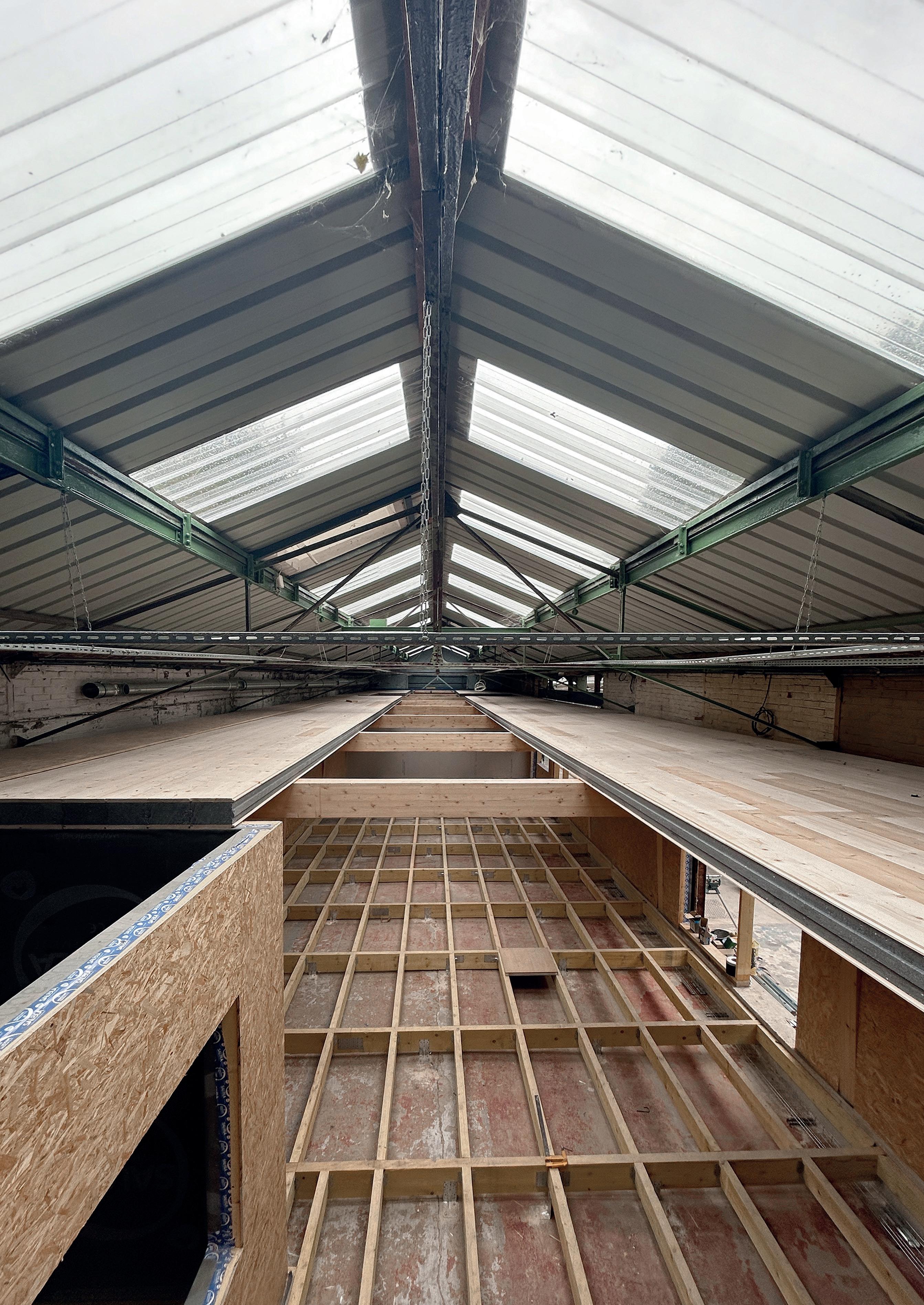 L'intervention majeure du projet consiste en l'insertion de volumes autonomes à l'intérieur de l'enveloppe existante, créant ainsi un dispositif spatial de modules évolutifs. Cette stratégie permet de résoudre plusieurs enjeux fondamentaux : créer des espaces de travail confortables thermiquement et acoustiquement sans transformer l'enveloppe globale, préserver le caractère réversible de l'intervention, et permettre une flexibilité programmatique sur le long terme. Ces microarchitectures, construites en ossature bois isolées, reposent sur des longrines en béton, permettant leurs réversibilités. Ces longrines répartissent linéairement les charges des portique structurels sur la dalle en terre-plein, tout en rattrapant les différences de niveau du sol existant. Combiné aux portiques, aux MOB et à une structure de faux plancher en en bastaings de bois, ce socle technique assure la stabilité de l'ensemble sans nécessiter de reprises en sous-œuvre complexes, dans une logique d'économie de moyens. La matérialité de ces volumes insérés, crée un contraste subtil avec le caractère brut de l'enveloppe industrielle : un bardage en bois de réemploi habille les façades des boîtes, tandis que leurs ouvertures, également issues de menuiseries de réemploi, créent un rythme aléatoire qui dynamise l'espace. Le camaïeu de vert pour des portes introduit un signal chromatique subtil qui qualifie et identifie les différents espaces de travail.