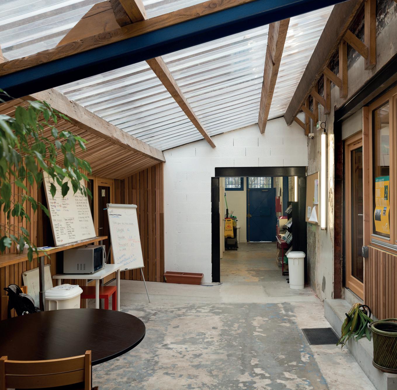 Le "patio", point névralgique du projet, opère une métamorphose radicale d'un espace autrefois résiduel. Là où se trouvait un renfoncement sombre, étouffé sous un bac acier opaque, émerge désormais un lieu de respiration et de lumière à la jonction entre le bâtiment sur quai et les halles. Devenu pivot du parcours spatial, il articule clairement l'entrée principale, la rue intérieure et les espaces communs, créant une polarité lumineuse au cœur du dispositif. Il est couvert d'une membrane transparente qui préserve la sensation d'extériorité tout en offrant une protection contre les intempéries. La conception ingénieuse de cette couverture, composée d'une "juxtaposition en deux niveaux d'une partie du polycarbonate", crée un interstice qui permet à l'air de circuler librement, instaurant une ventilation naturelle sans compromettre l'abri. Ce dispositif subtil apporte une qualité de lumière zénithale exceptionnelle, dessinant un espace aux ambiances changeantes au fil de la journée, lieu de pause et de rencontre désormais investi par les utilisateur·ices qui "mettent des plantes, des tables" et s'approprient cet espace devenu le cœur sensible du projet.