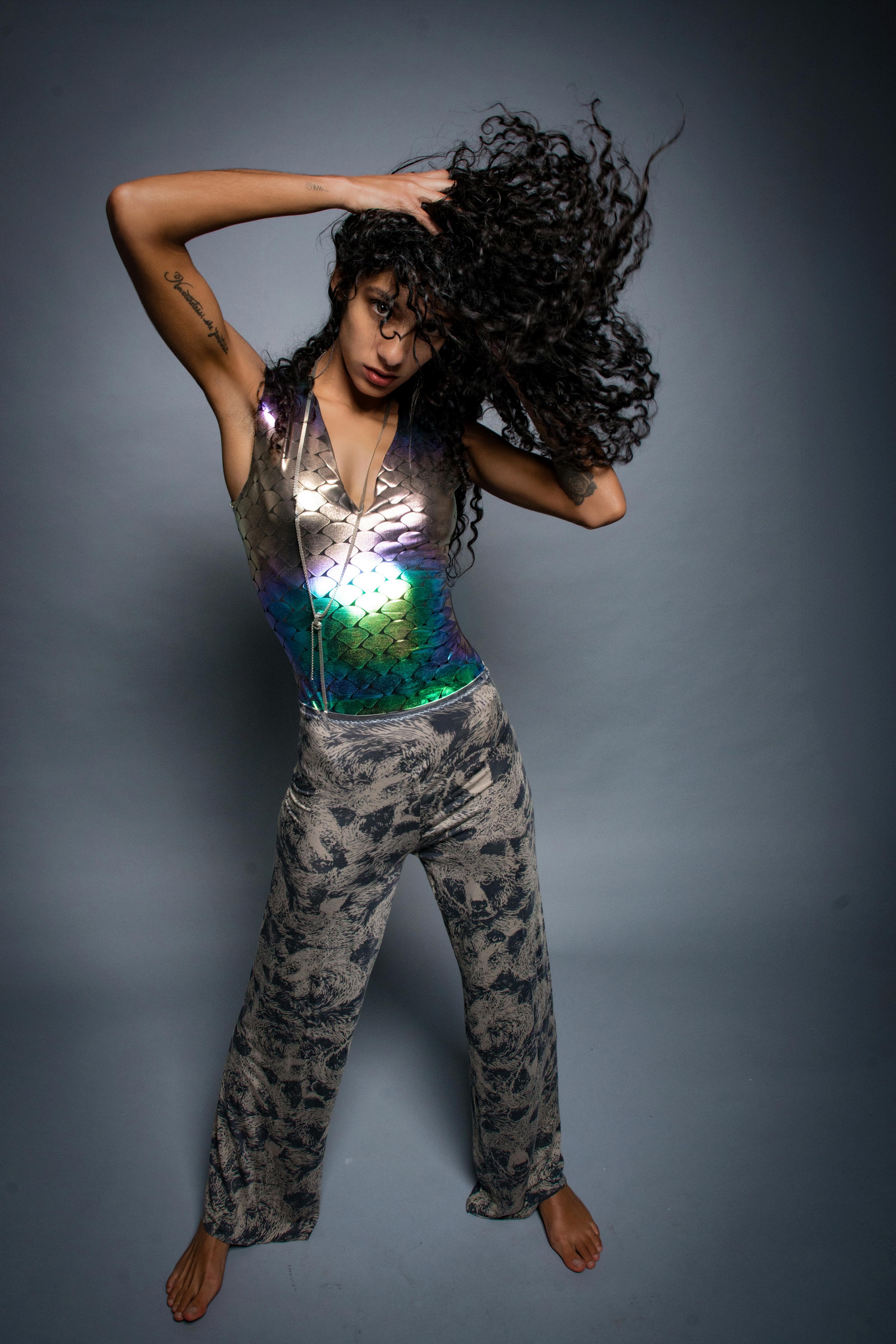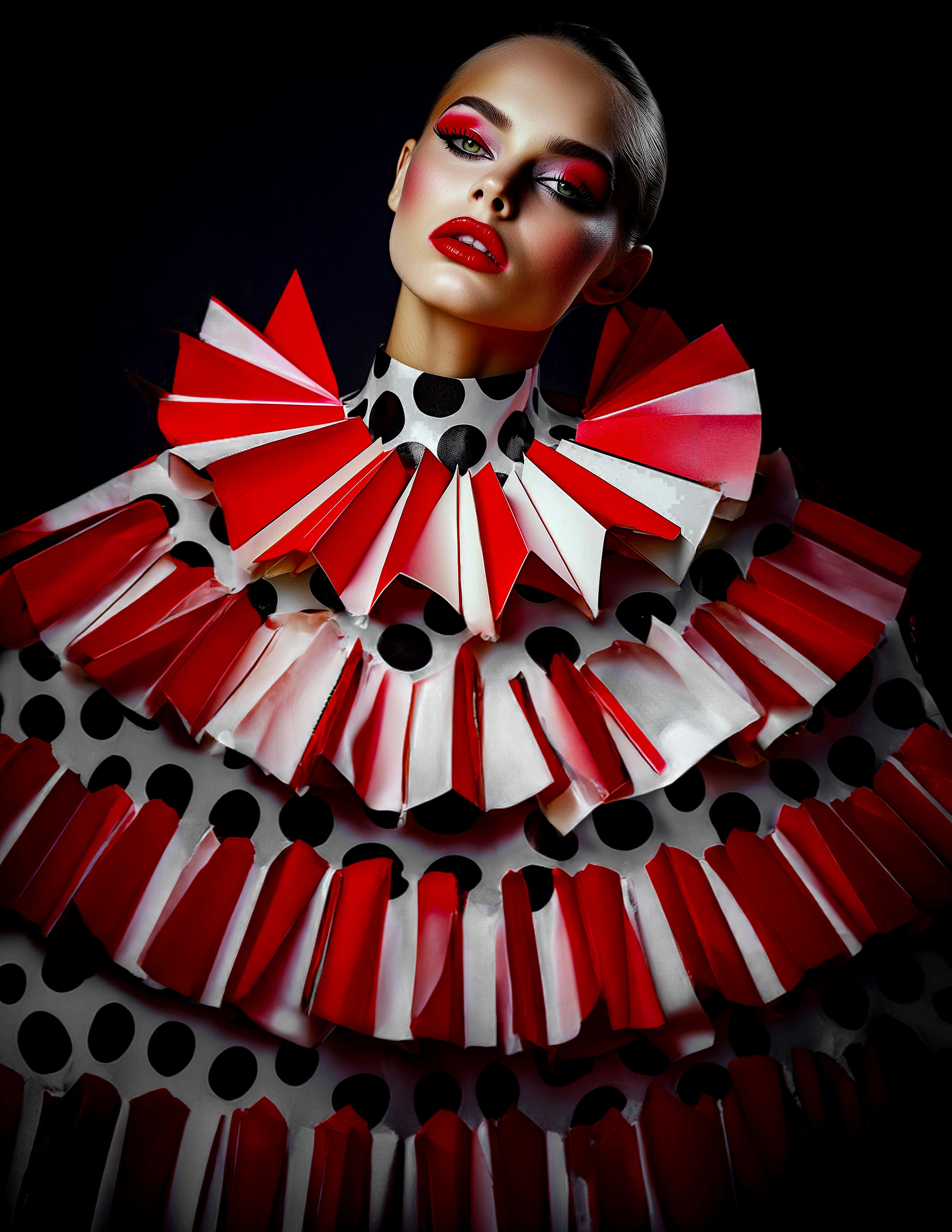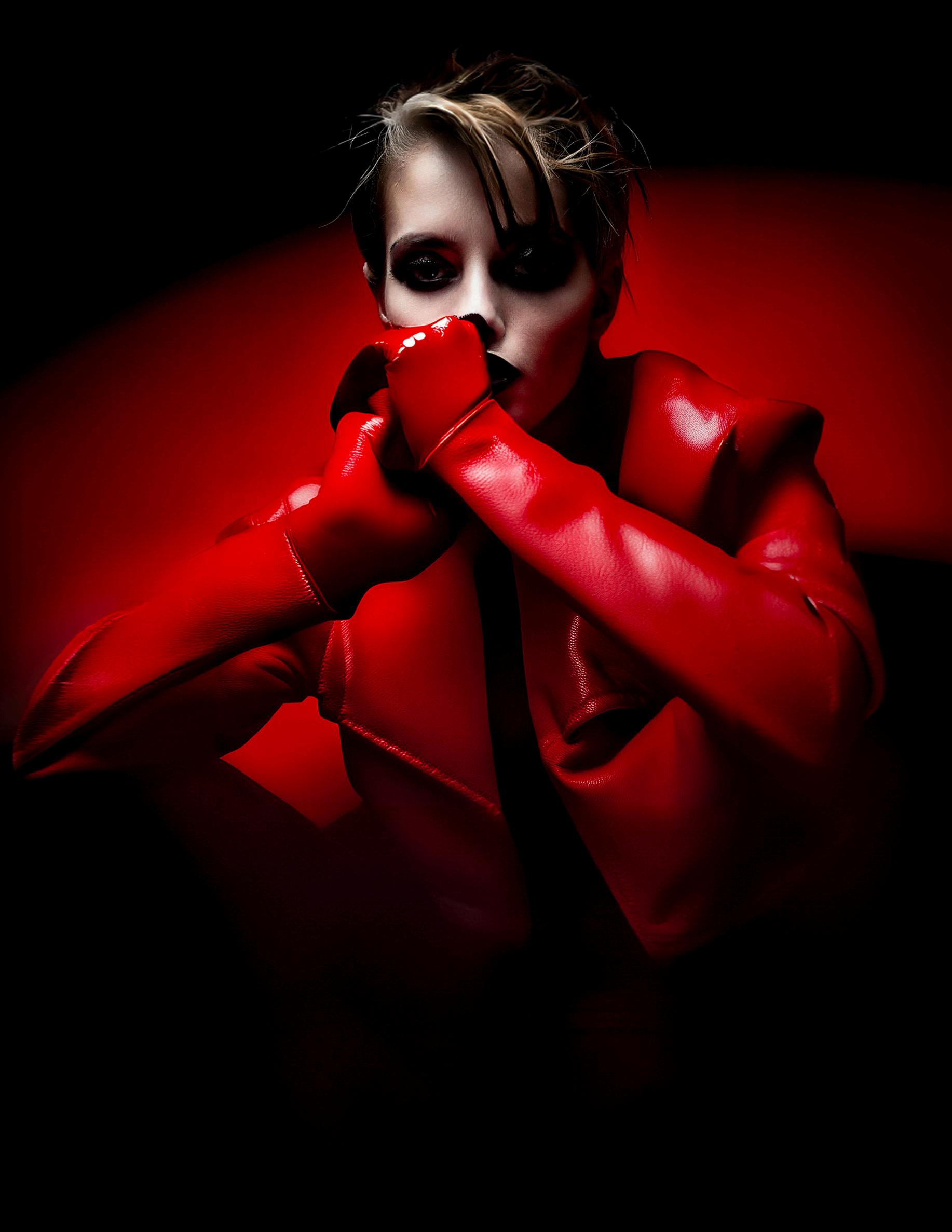 In another moment, she reclines in the sea of liquid rubies, her presence commanding the vast expanse of red. The glossy fabric of her suit glistens like freshly spilled ink, each fold and seam a ripple in the molten landscape She is both the calm and the storm, the quiet before the eruption and the fierce explosion of color and light. Together, these moments weave a tale of rebirth and transformation. The goddess of scarlet, a beacon of fiery elegance, moves through her realm with a grace that is both otherworldly and profoundly human