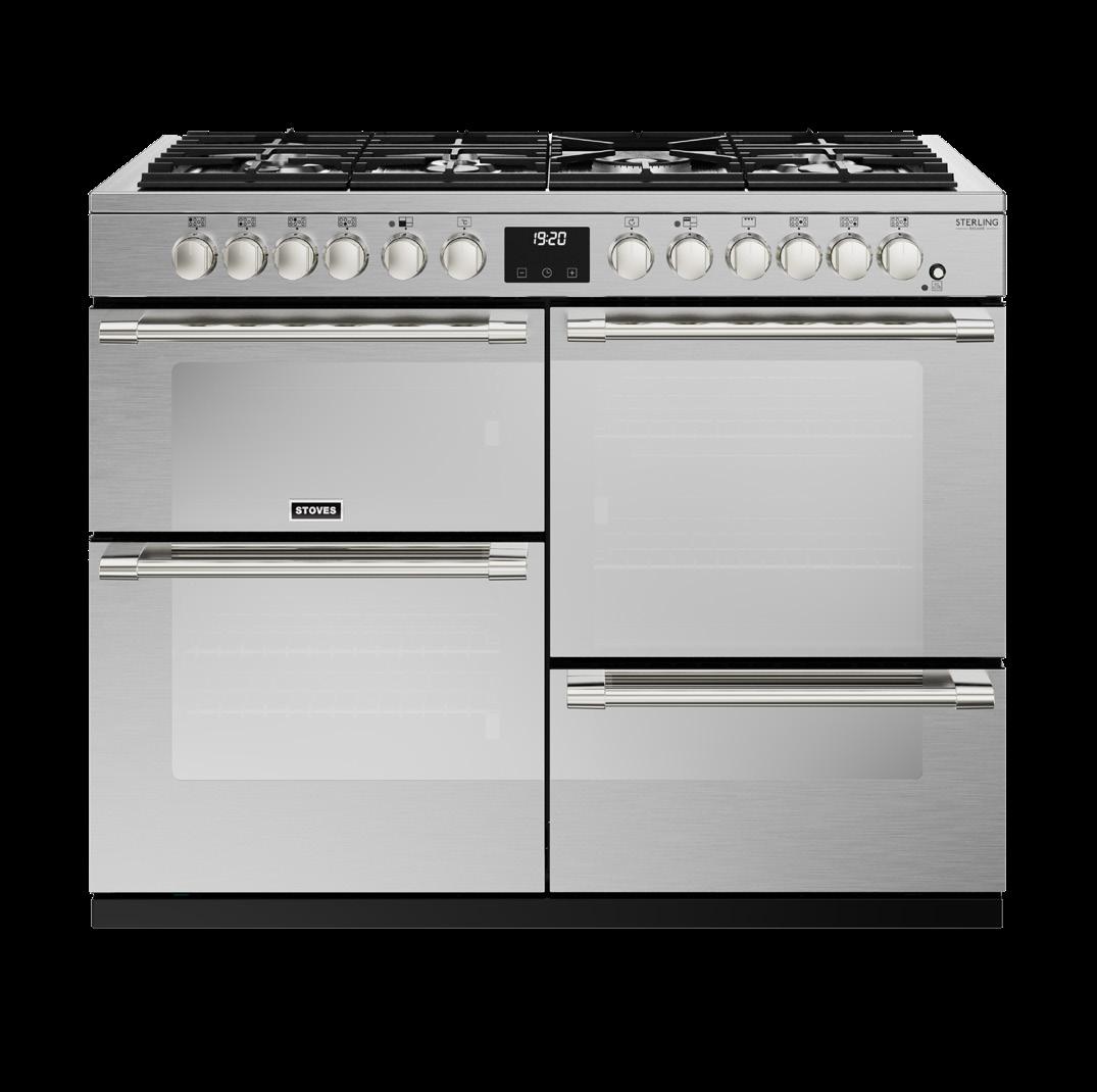 1100mm Sterling Deluxe dual fuel range cooker with 4kW PowerWok™ burner. Features include the four cavity Quad Oven™ with 204 litres total cooking capacity, 13 setting multifunction main oven with TrueTemp digital thermostat