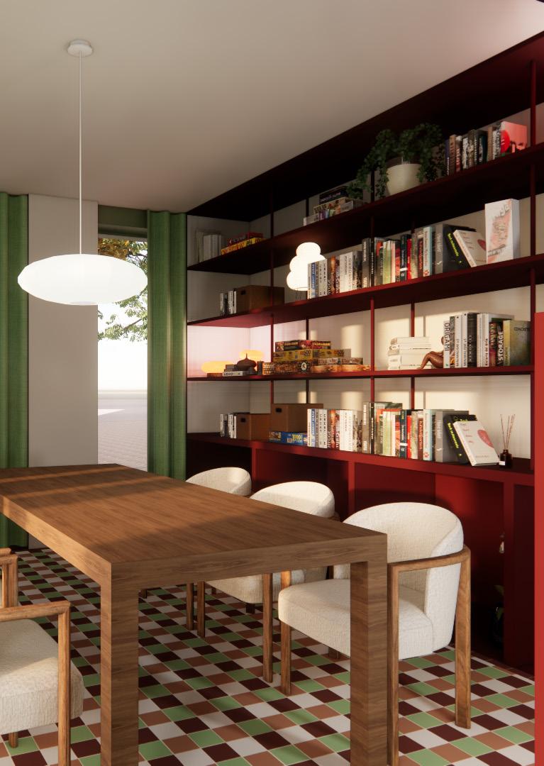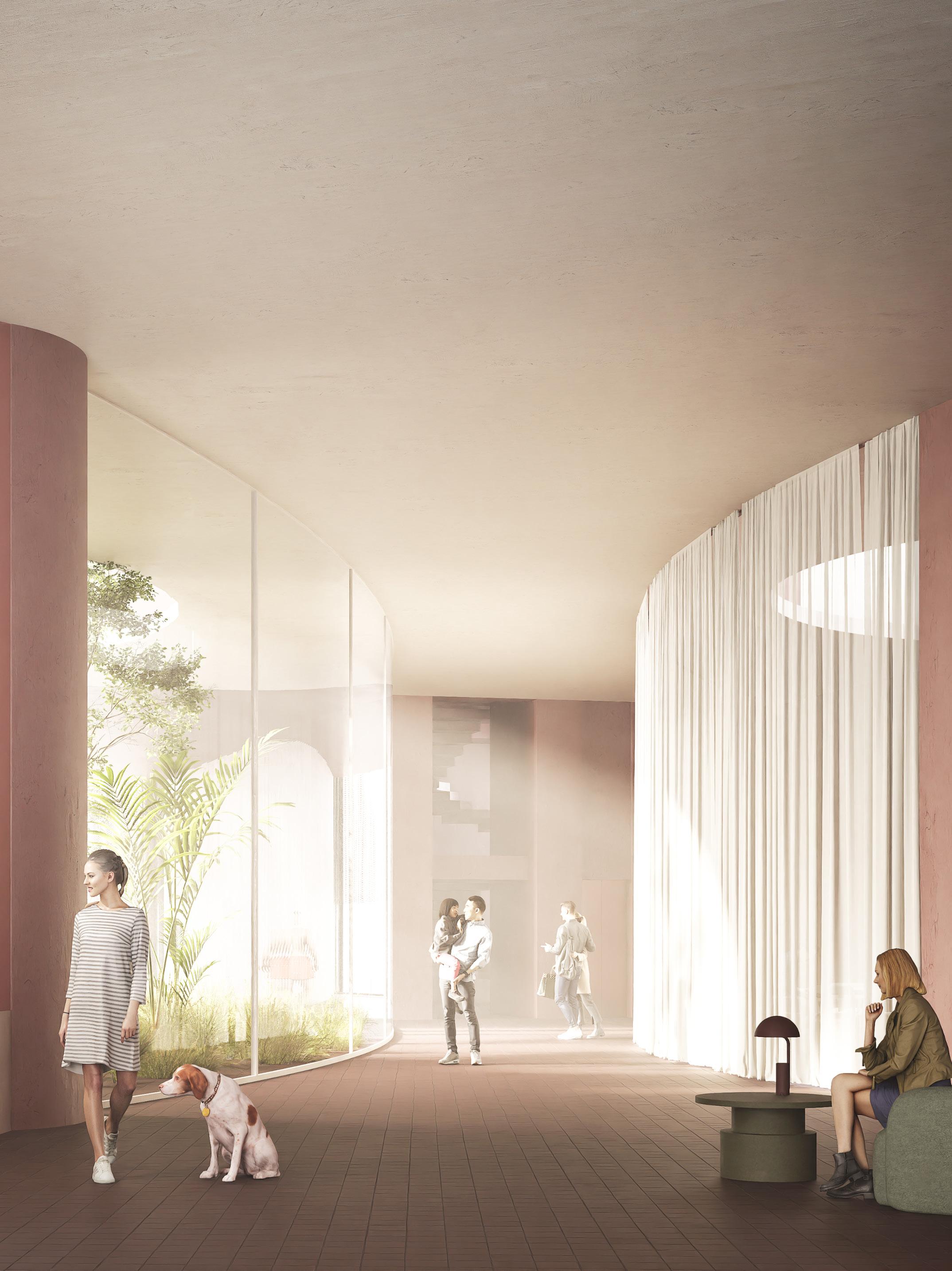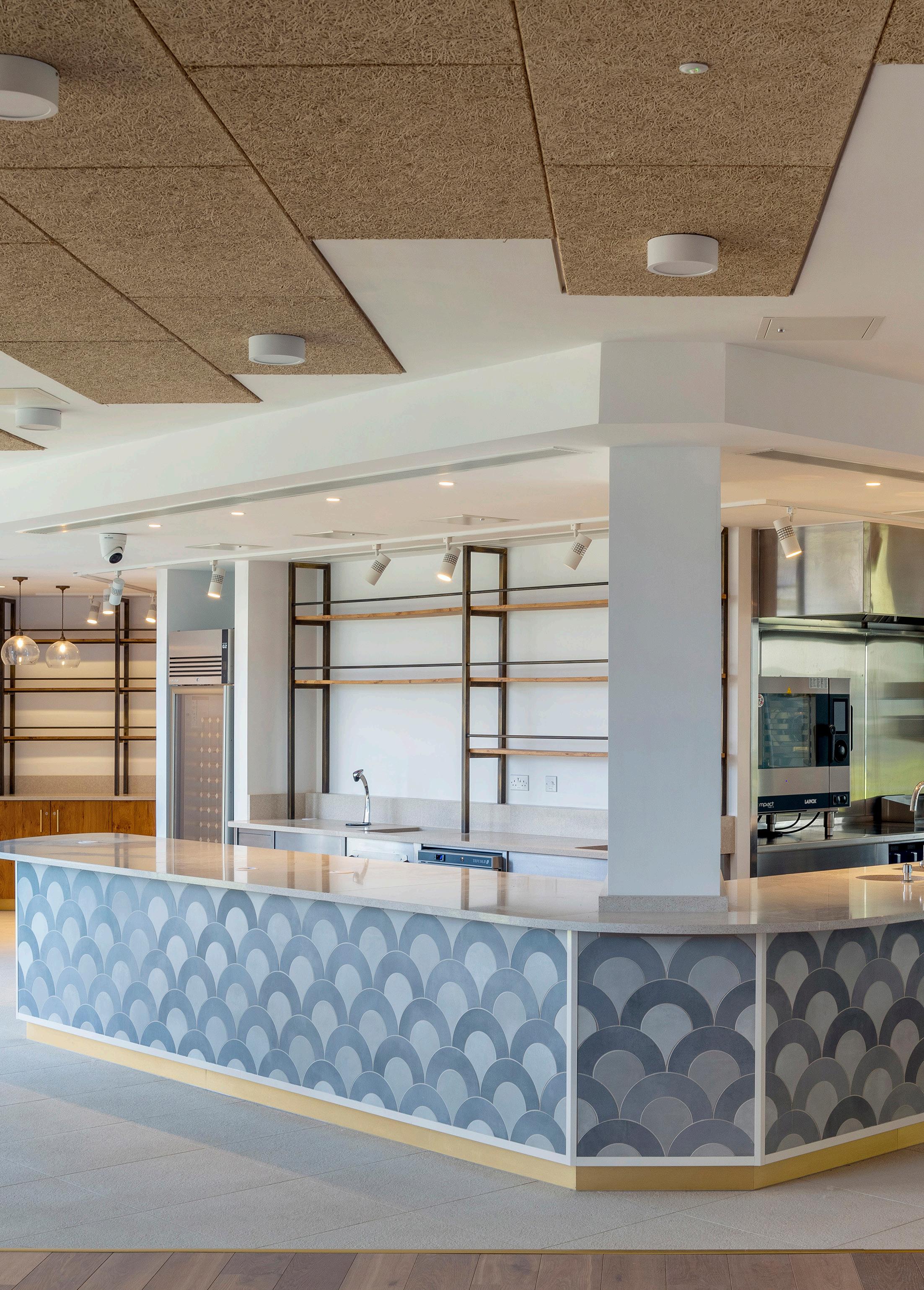 At ground level, the building fosters active frontage and ease of pedestrian movement through the site, while its first floor terrace offers panoramic views across the square, overlooking the adjacent open-air performance stage and creating an animated focal point within the development.