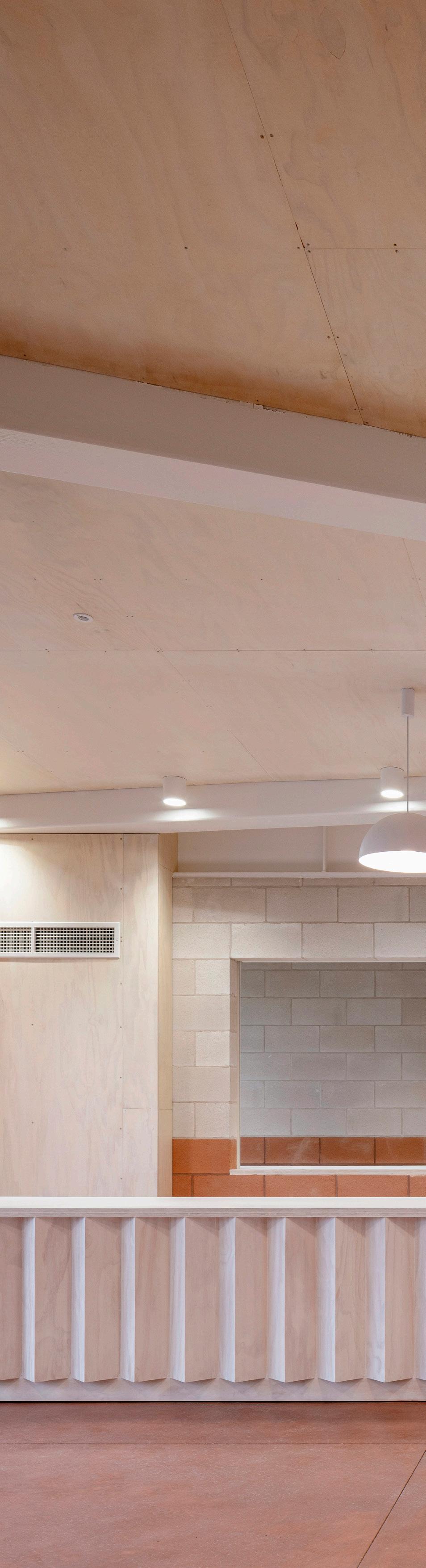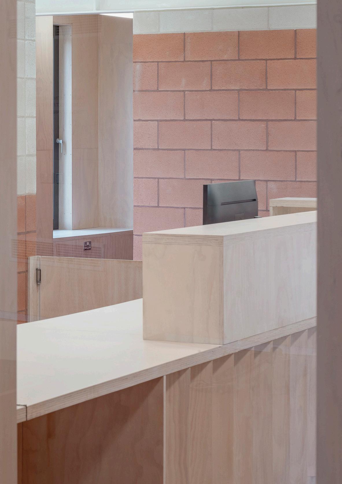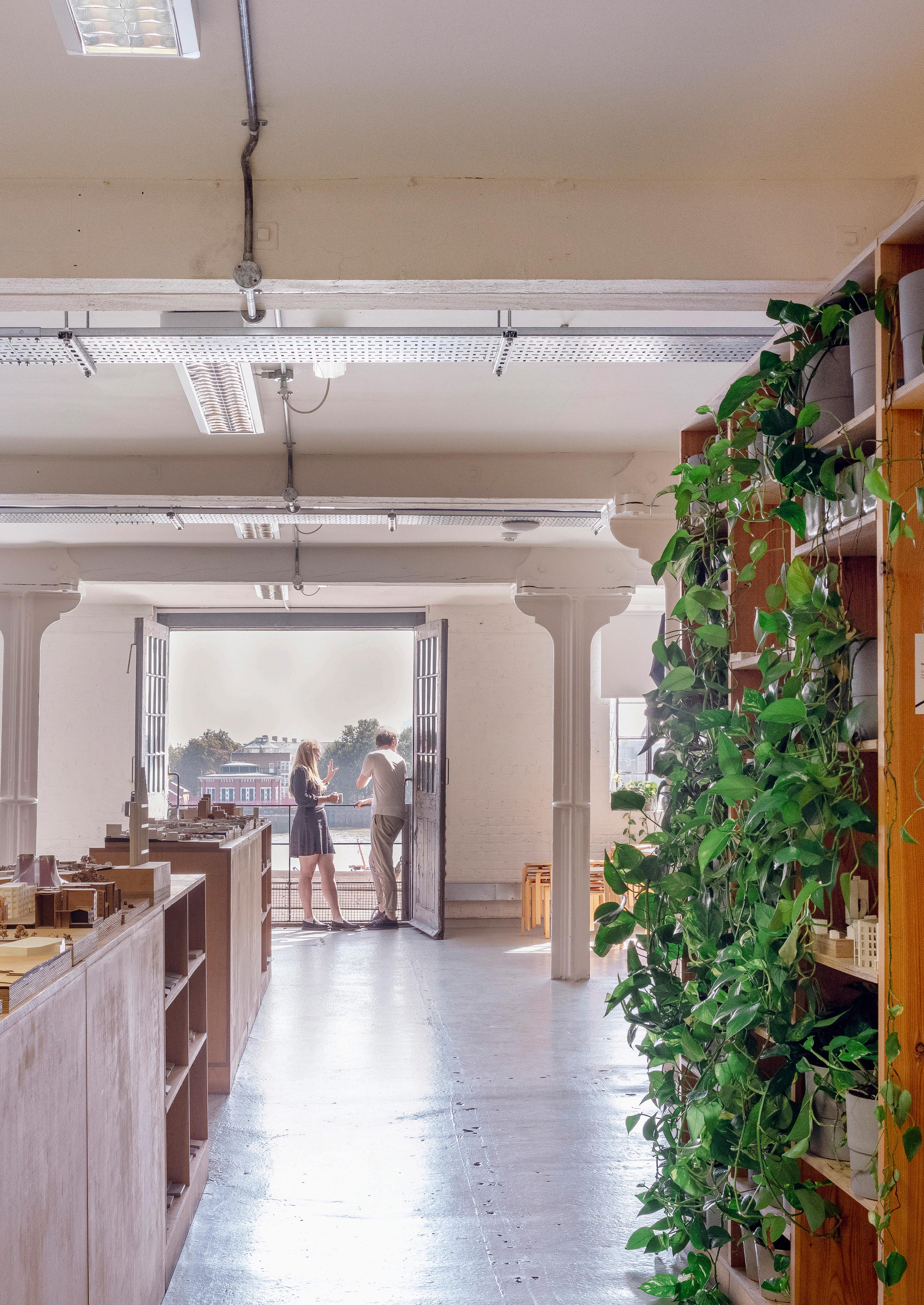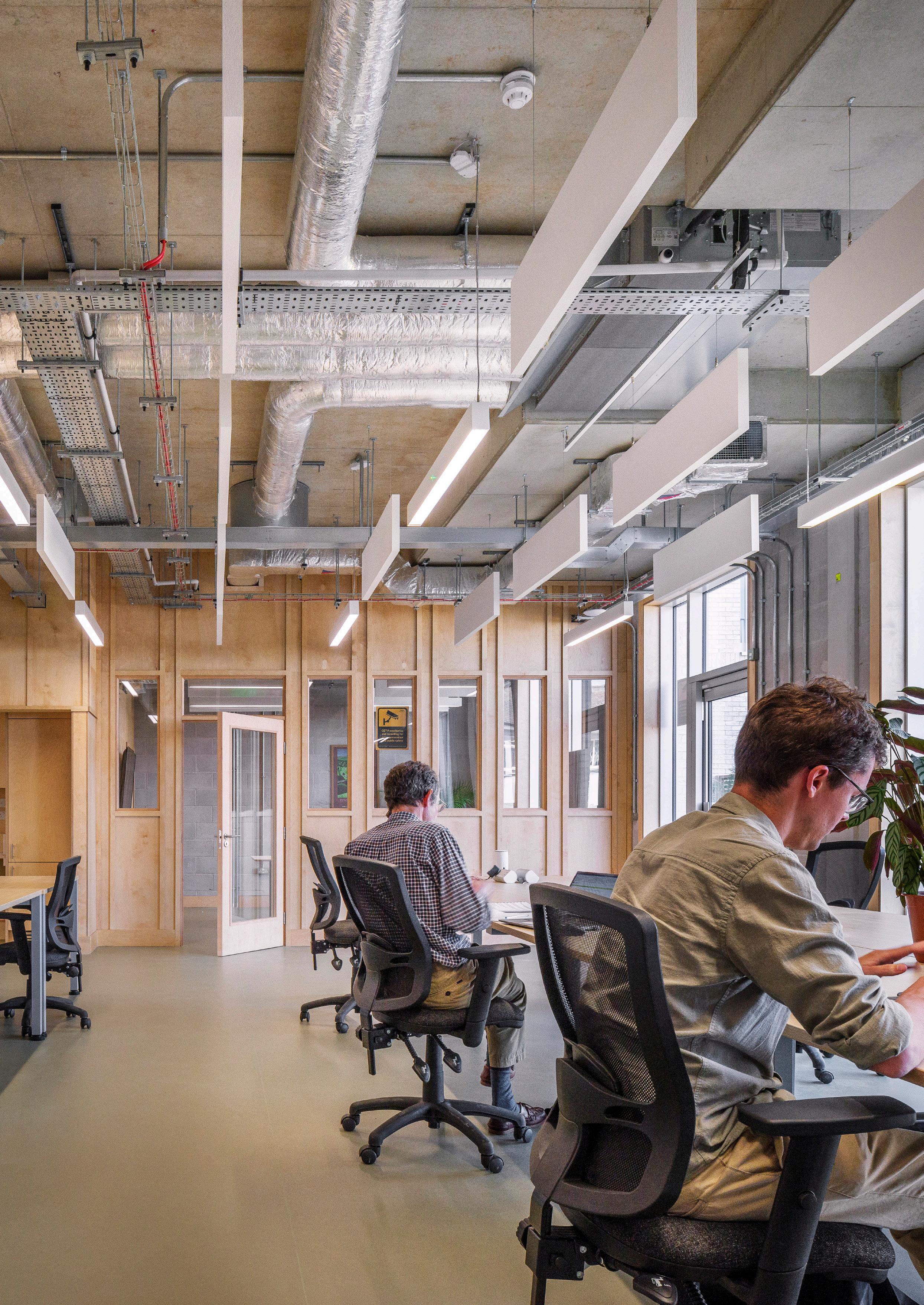 Free-standing partitions, shelving, kitchen and storage units constructed from naturallyfinished plywood give a visual coherence and warmth to the open plan office space that contrasts with the white painted brick, timber and cast iron of the warehouse structure.