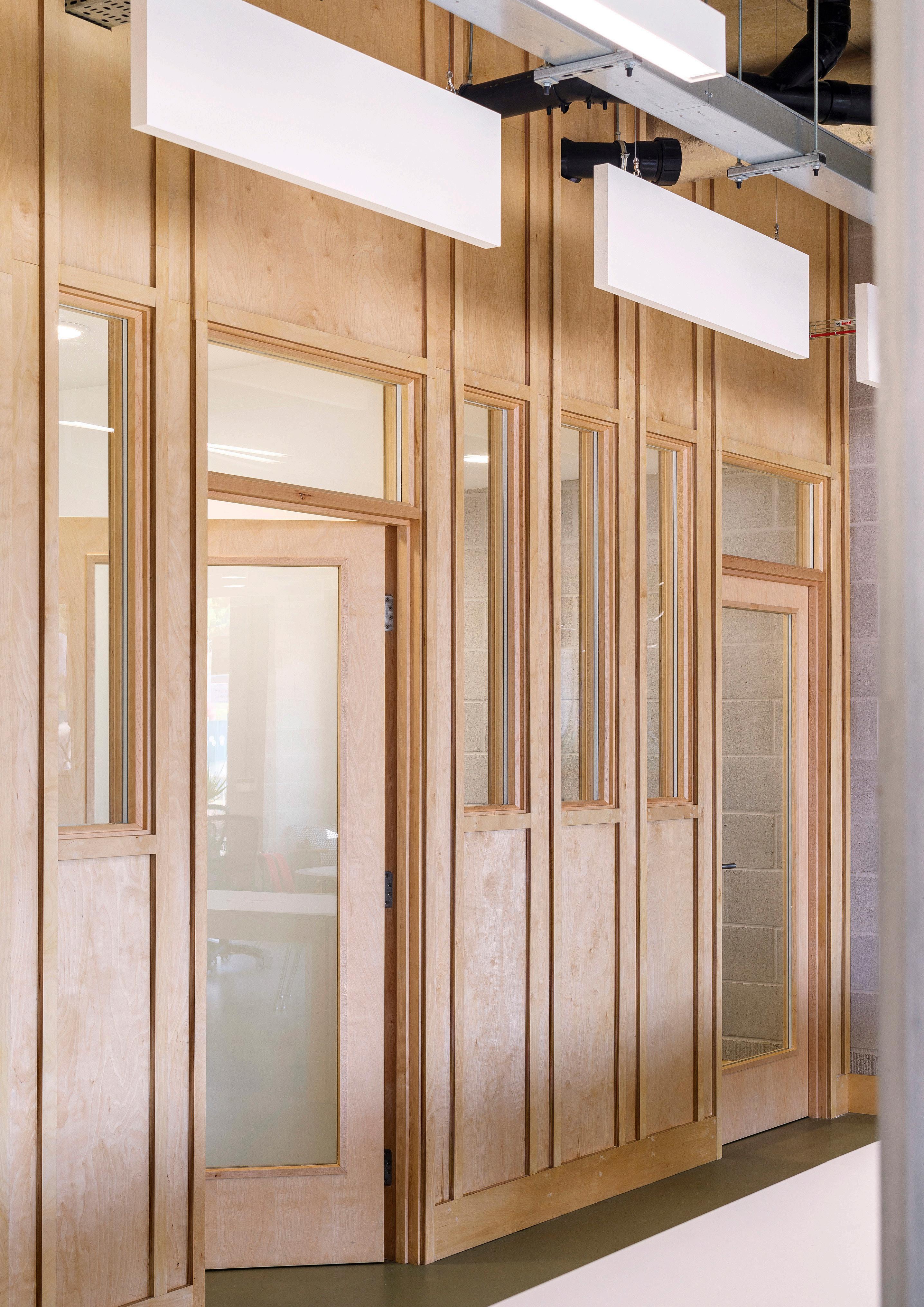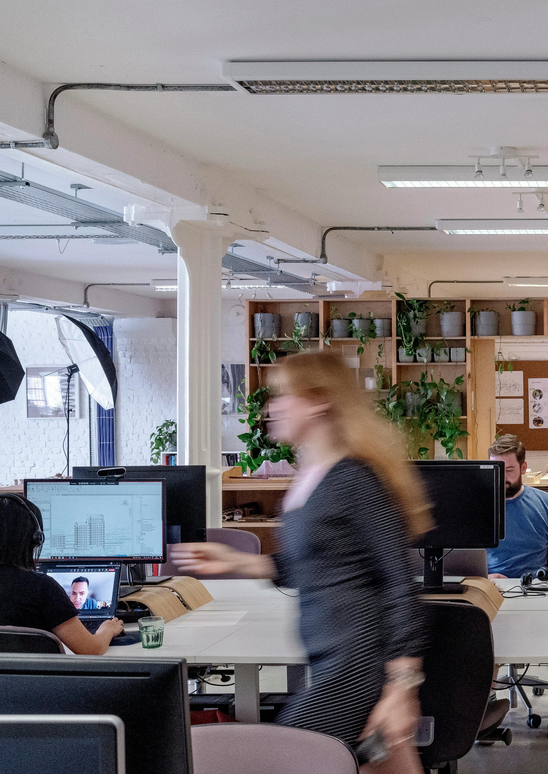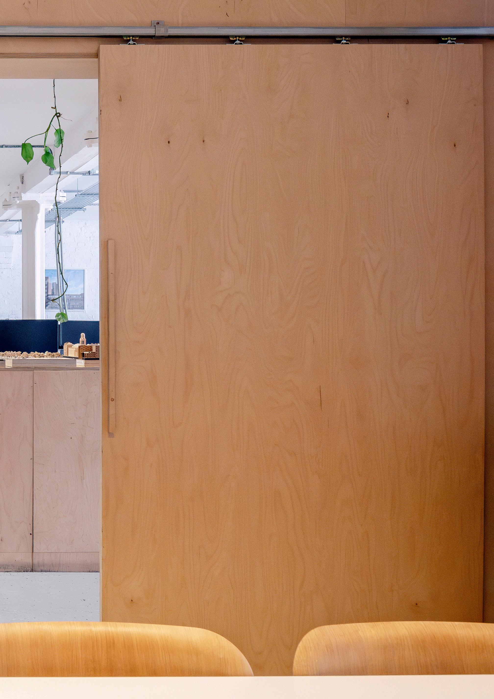 The plywood is complemented by other natural materials; galvanised cable trays and cork pin-up boards. The layout of the office emphasises the open, collaborative nature of the studio whilst providing different environments to work in.