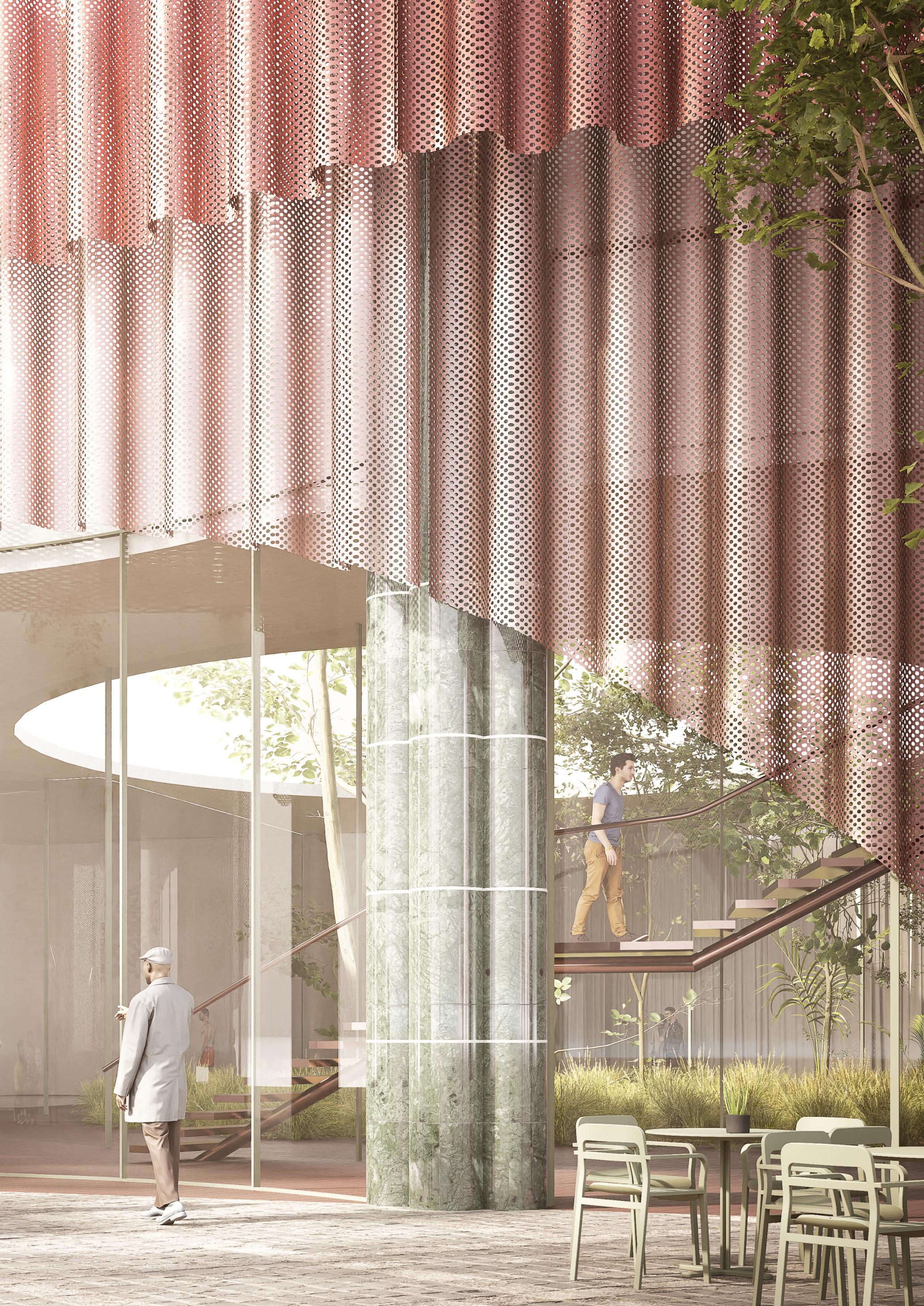 Robust, natural materials ensure the building complements its park setting. Perforated copper panels clad the exterior and conceal plant equipment, arranged in pleats that animate the elongated façade. From afar, these pleats establish a striking vertical rhythm against a boulevard of mature lime trees, while closer inspection reveals a captivating interplay of transparency, solidity, and shadow.