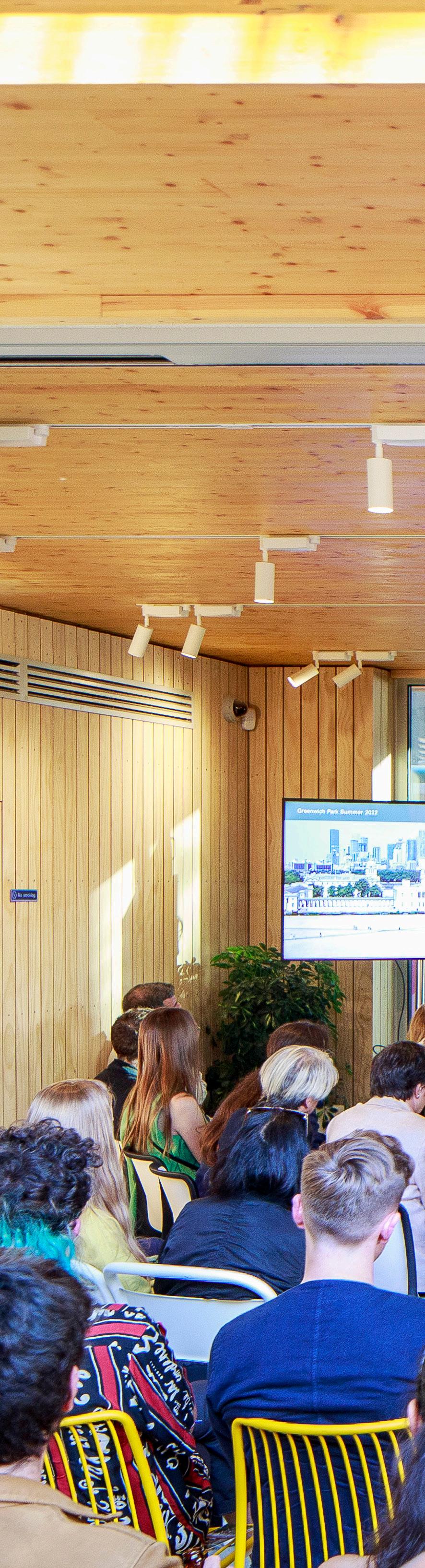 The triangular pavilion is formed by three volumes bound together by an oversailing roof terrace centred on an existing mature London plane tree afforded the benefits of shade, elevated views across the park, and the opportunity to circulate beneath the tree’s canopy.