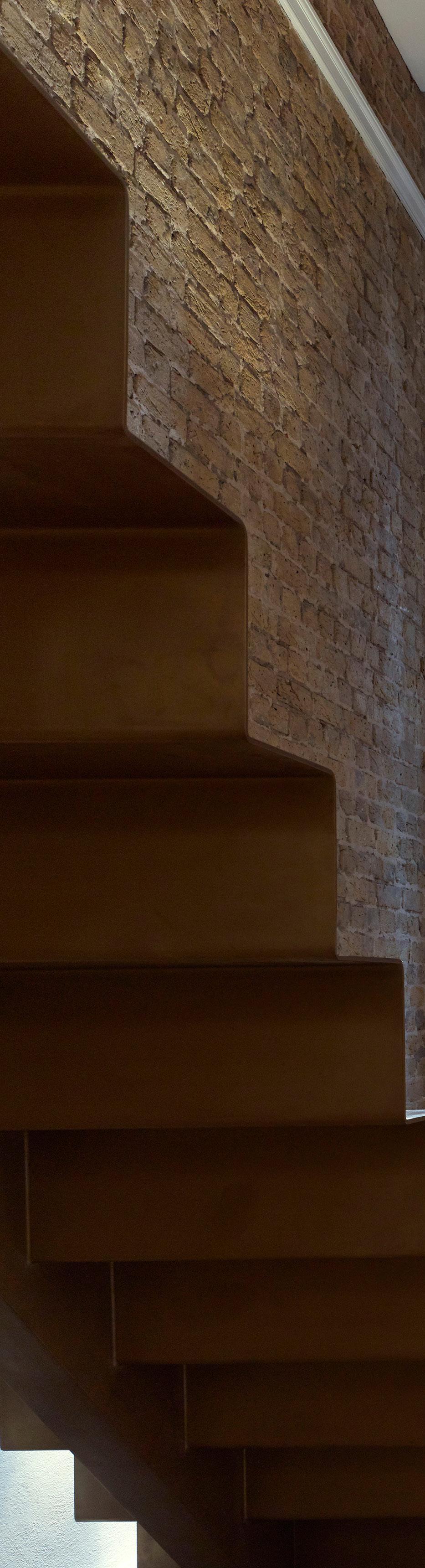 A 6mm steel sheet was folded and welded before being finished using the innovative process of spraying atomised brass directly on to the steel. The brass finish compliments with the rough existing brickwork to create a dynamic meeting of old and new.