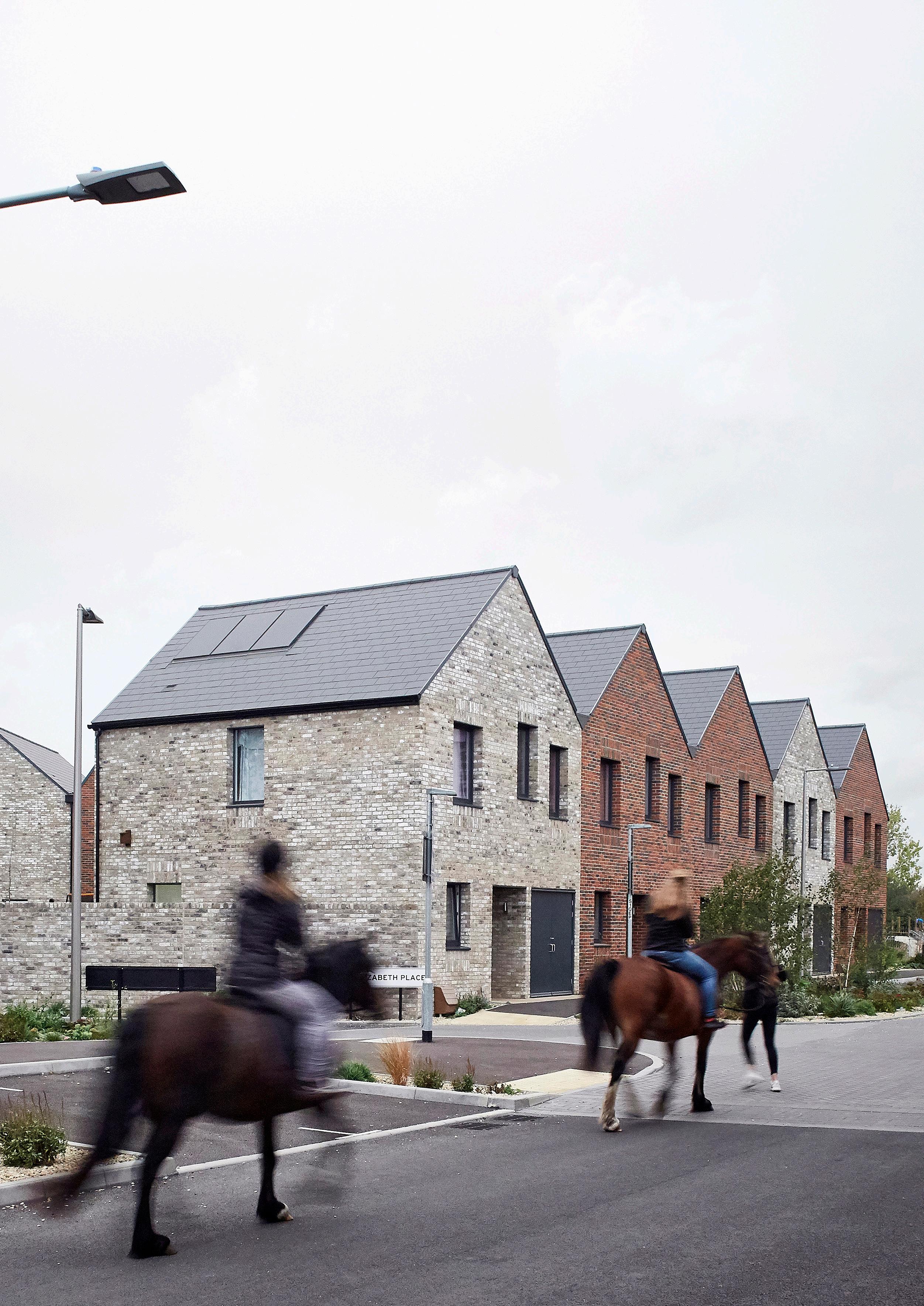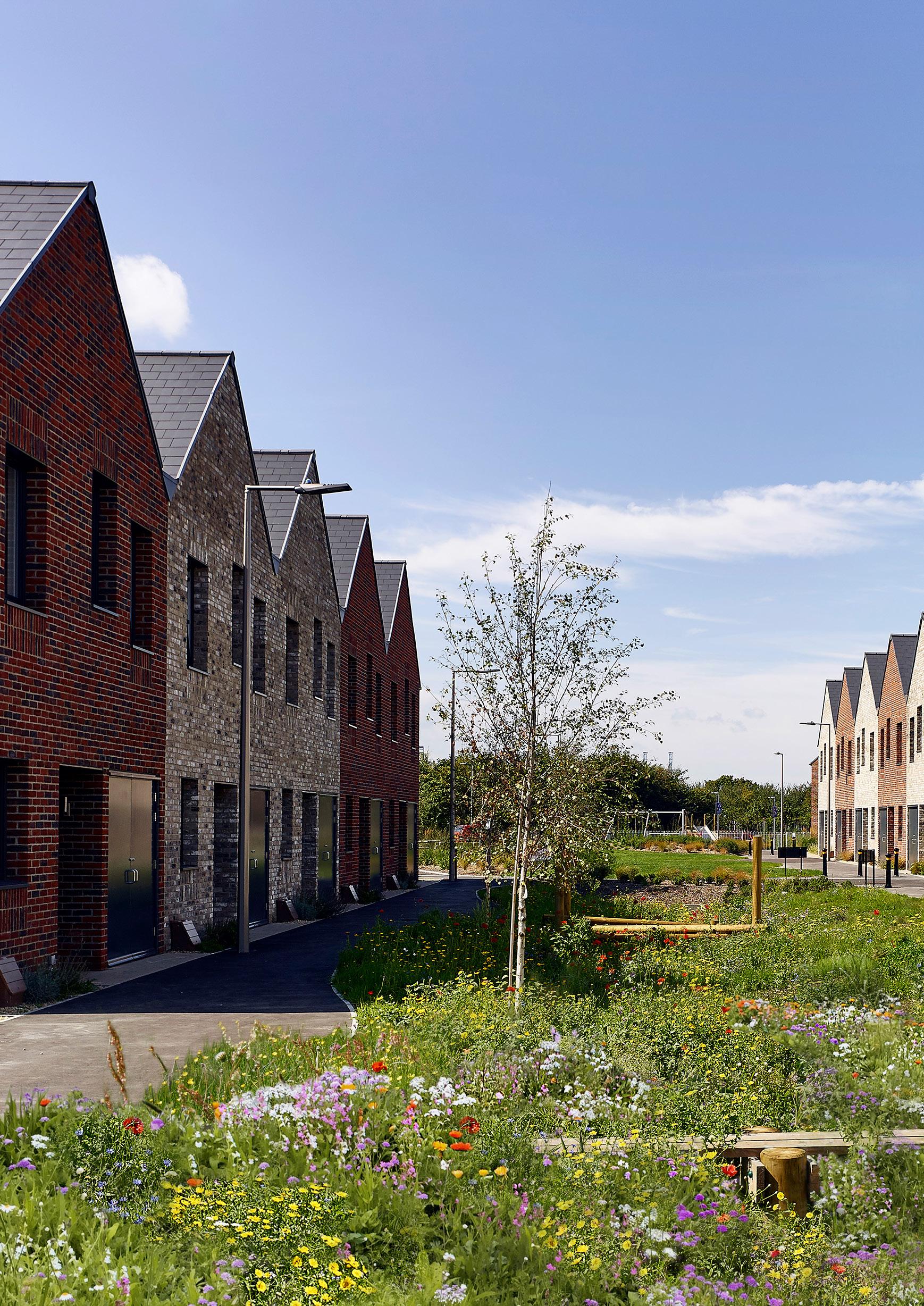 The 850-home neighbourhood forms part of a wider new town and is grounded in sustainable urban design principles. It features car-free streets, mews-style developments, and a rapid transit system.