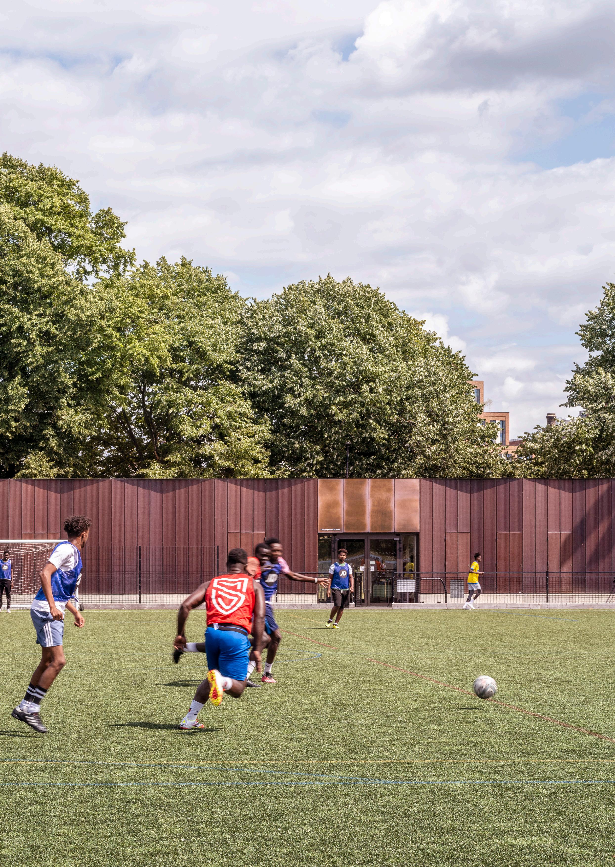 Burgess Park, a key element in Southwark’s network of green spaces, is a beloved destination for recreation and community activities. Commissioned by Southwark Council, Bell Phillips Architects designed the pavilion to provide upgraded facilities for cricket, rugby, and football, supporting the council’s initiative to expand accessible community sports spaces across the borough.