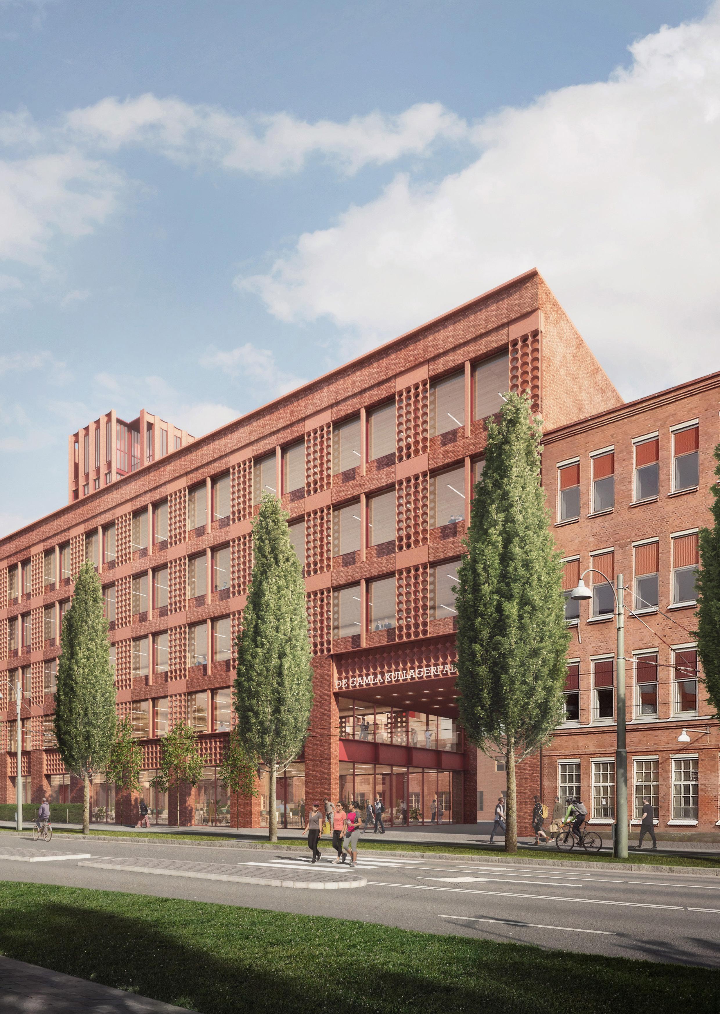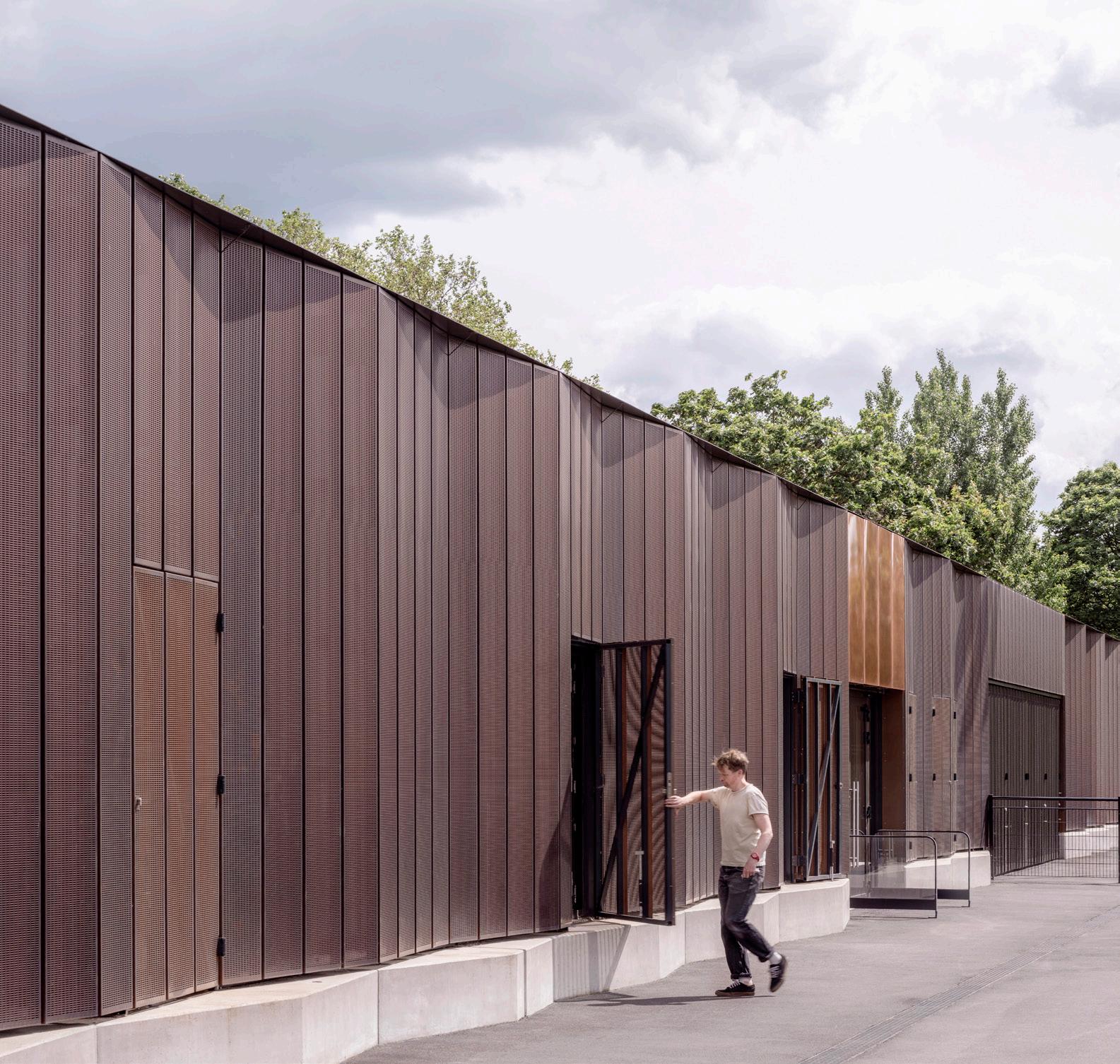 Robust, natural materials ensure the building complements its park setting. Perforated copper panels clad the exterior and conceal plant equipment, arranged in pleats that animate the elongated façade. From afar, these pleats establish a striking vertical rhythm against a boulevard of mature lime trees, while closer inspection reveals a captivating interplay of transparency, solidity, and shadow.