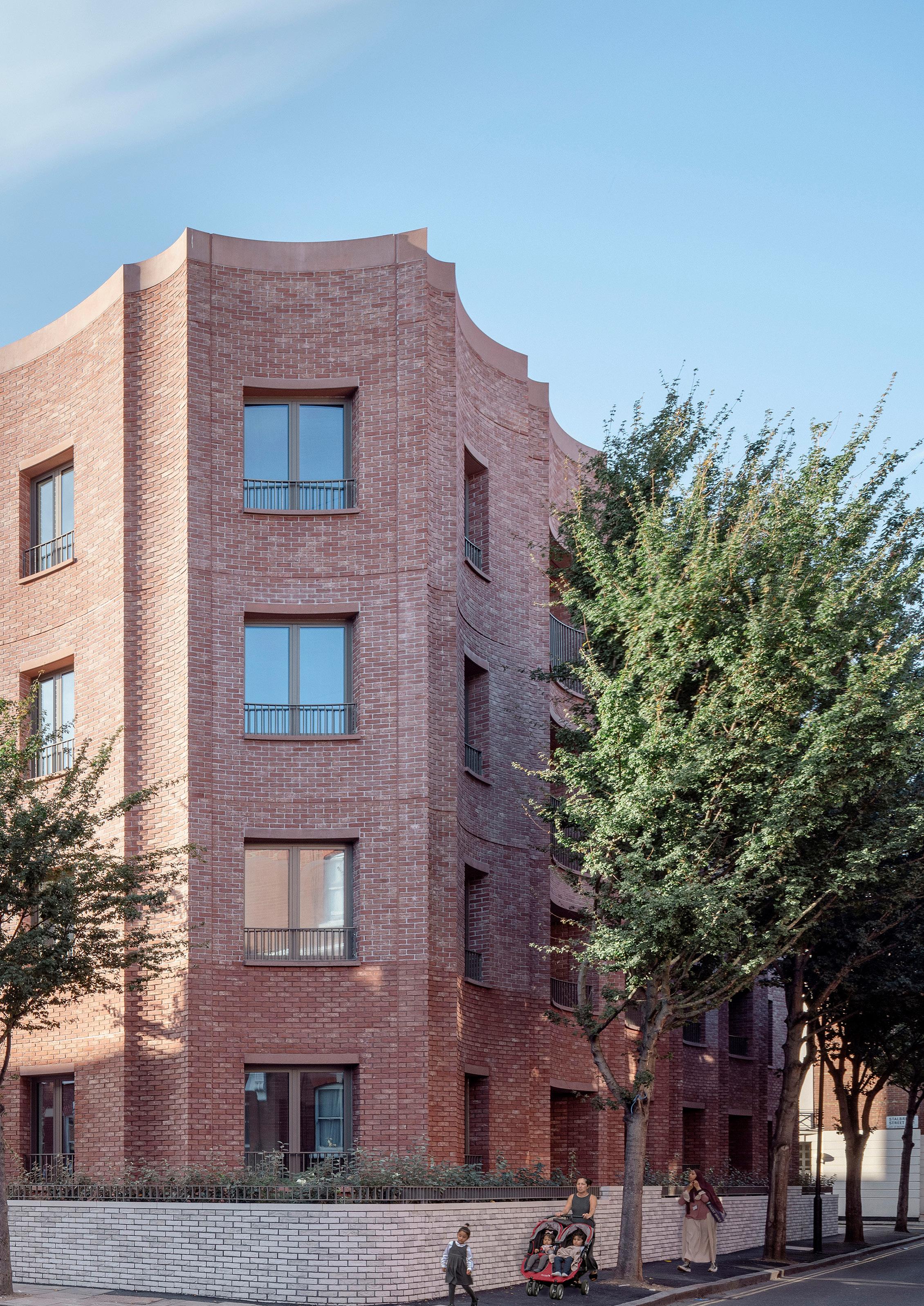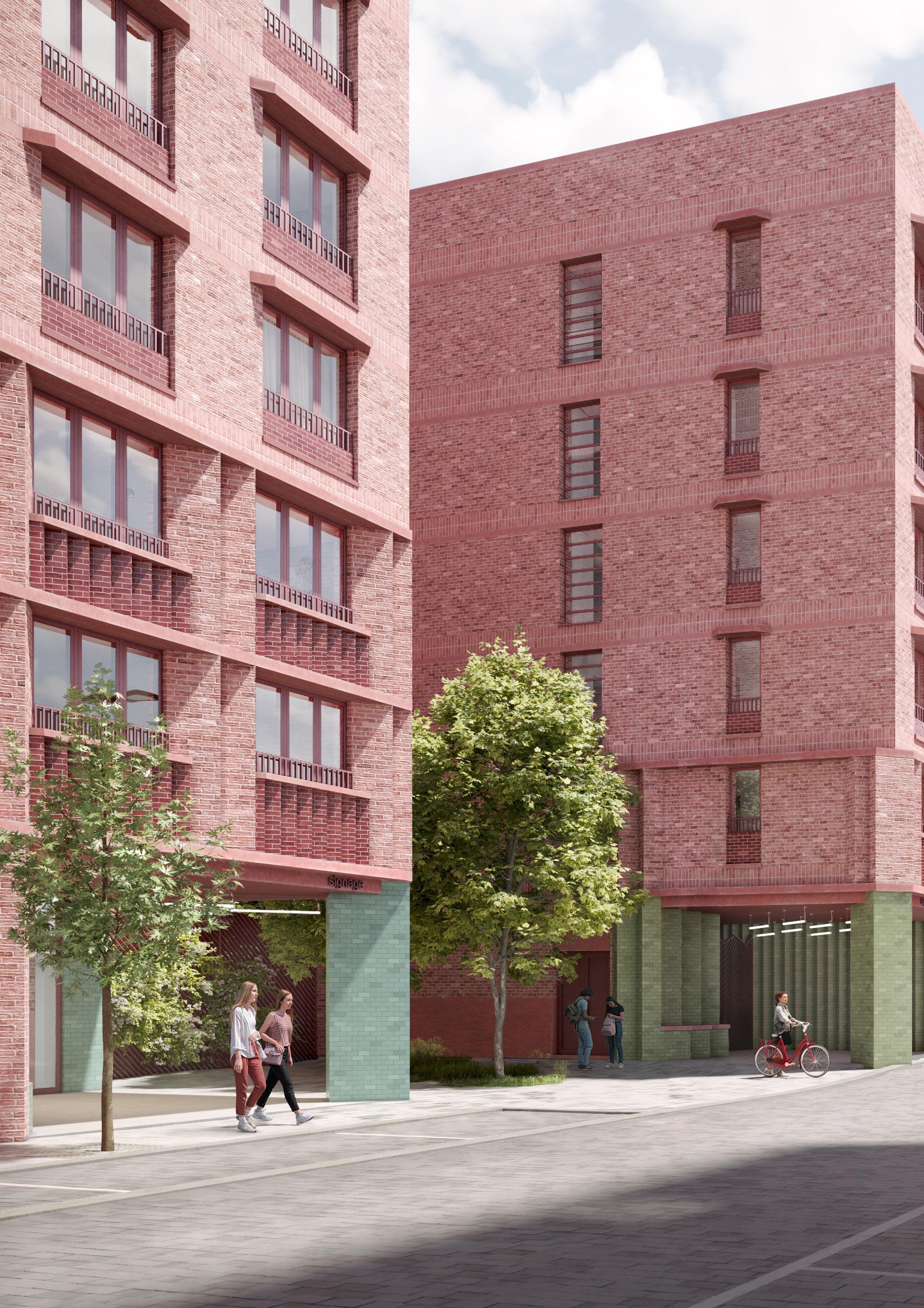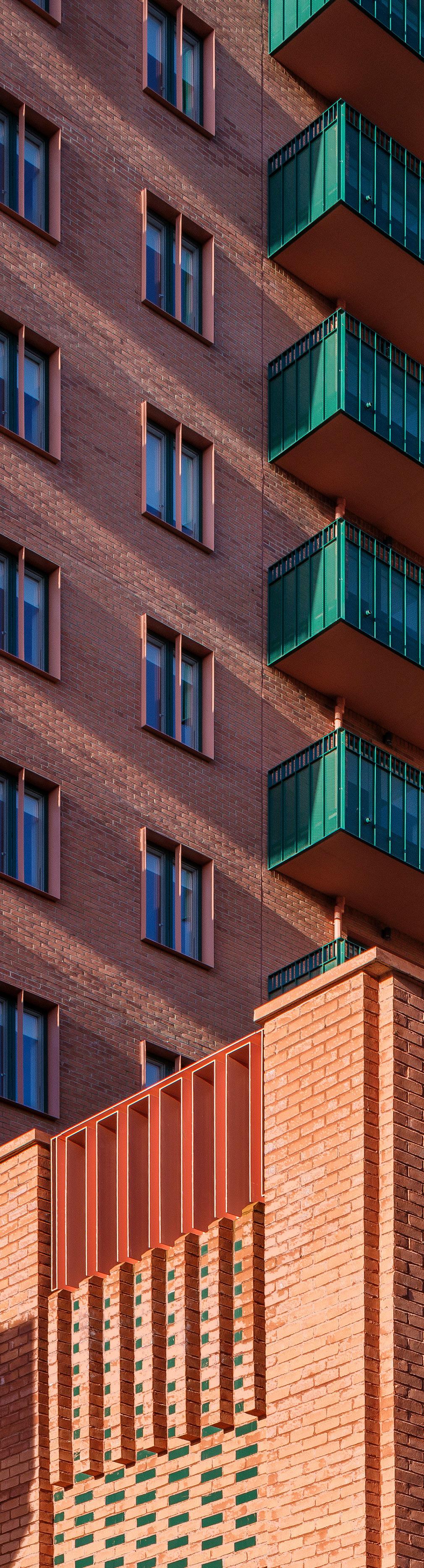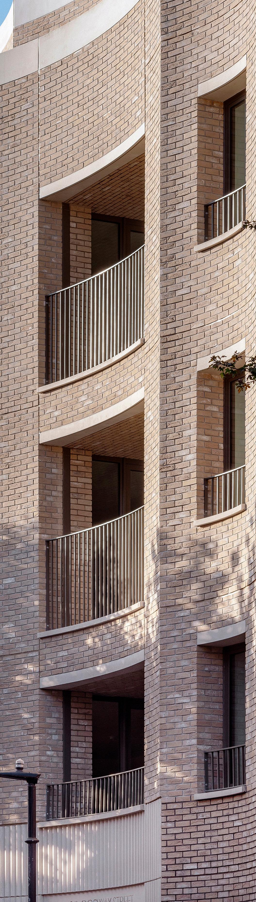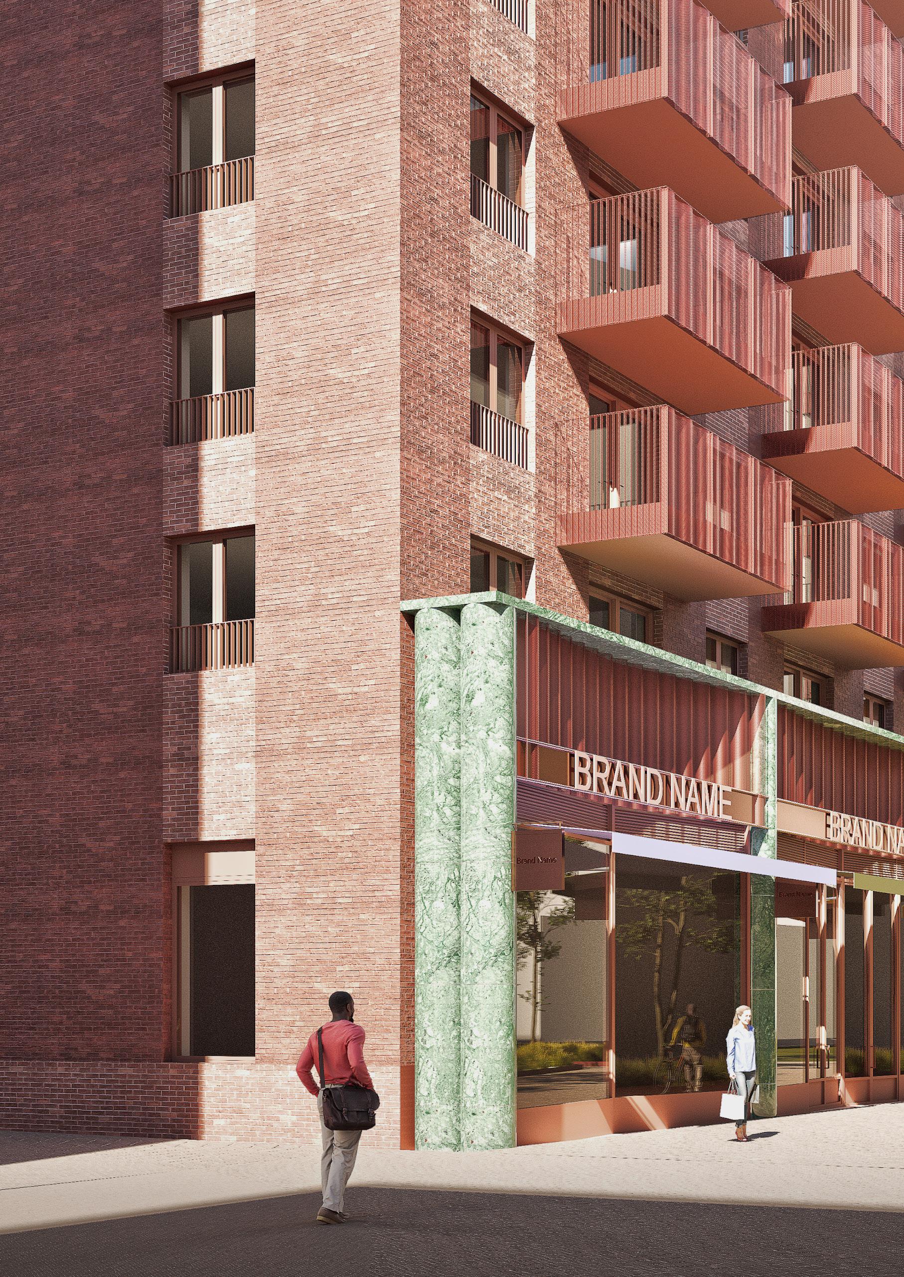 The building’s strongly articulated podium uses patterned and articulated brickwork to emphasise entrances and creates a play of contrasting materials and textures. The entrance lobbies and communal spaces have been carefully considered in both colour and materiality and the client has commissioned an artwork by Bud Studio for each residential entrance which reflects the character, market and people of the local neighbourhood.