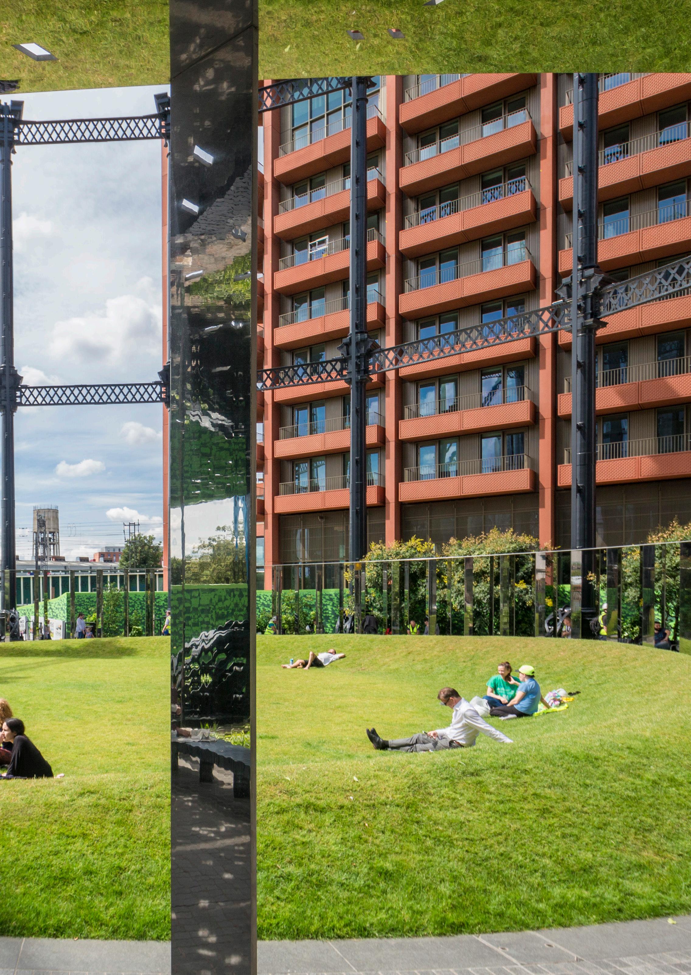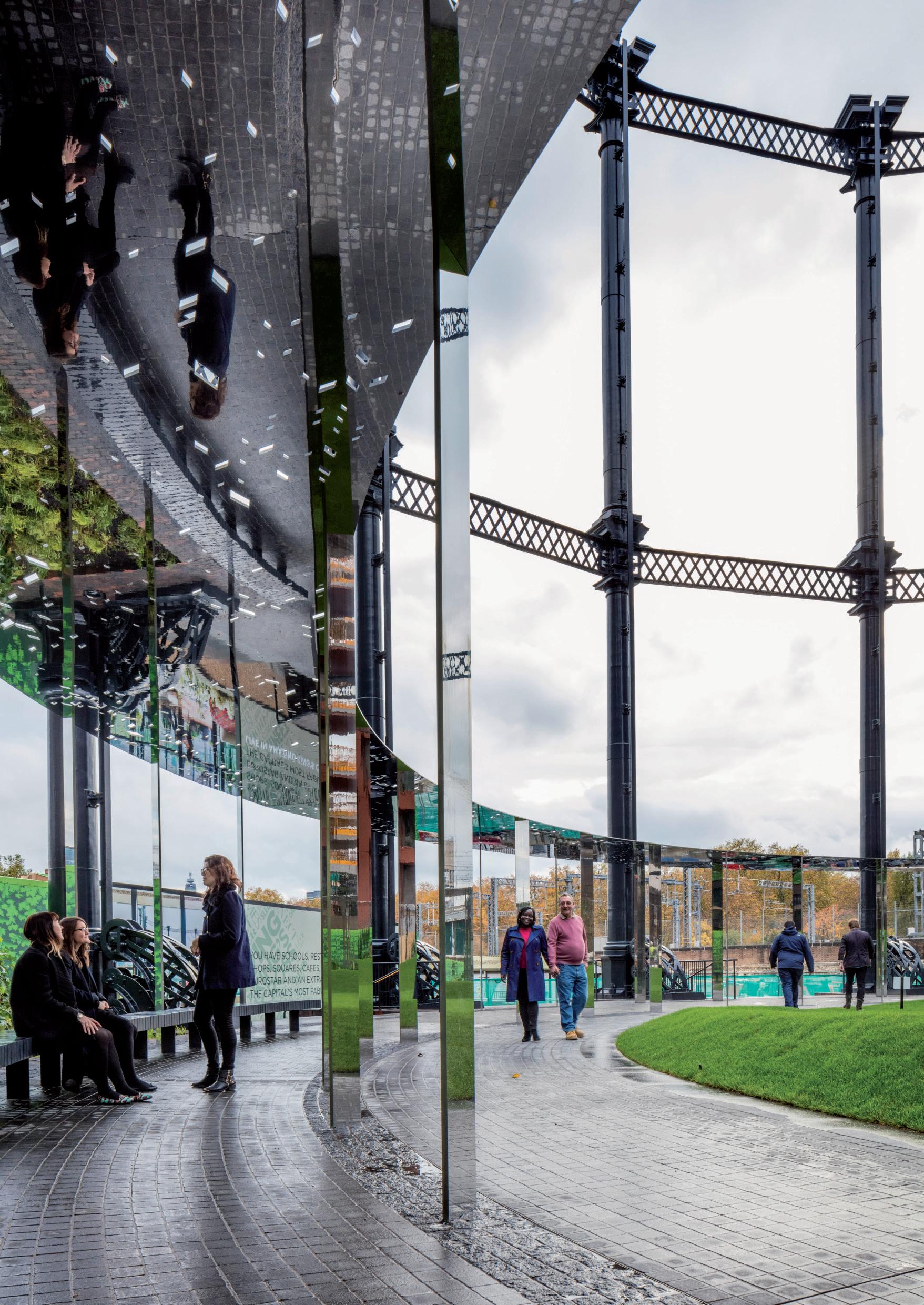 In 2008 we won a design competition to remodel the Grade II listed Gasholder No. 8 as a new public space in the heart of King’s Cross. The proposal frames a central garden with a stunning mirror-polished stainless steel colonnade within the Victorian gasholder guideframe. The new structure provides a more intimate and contemporary counterpoint to the vast historic structure.