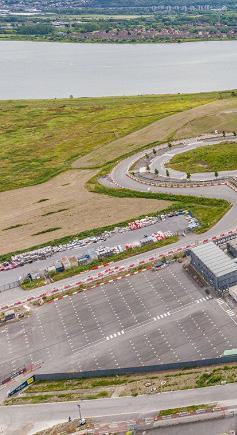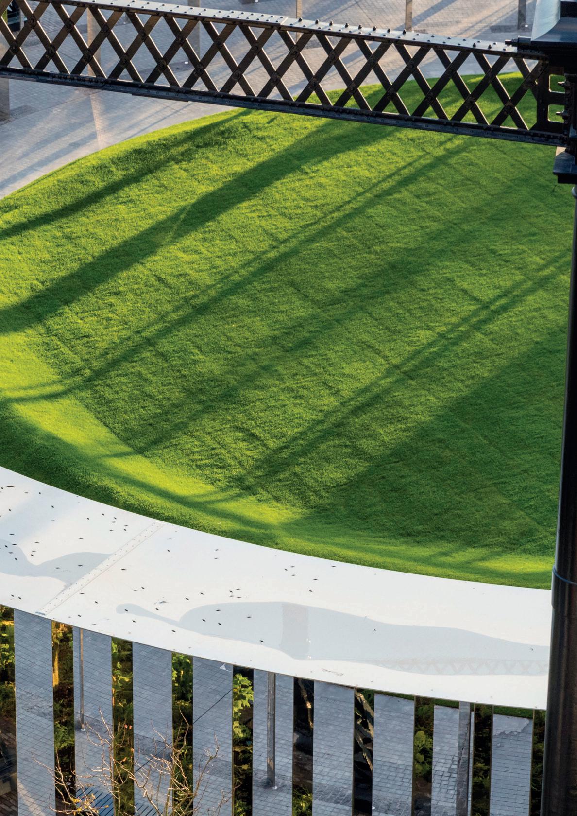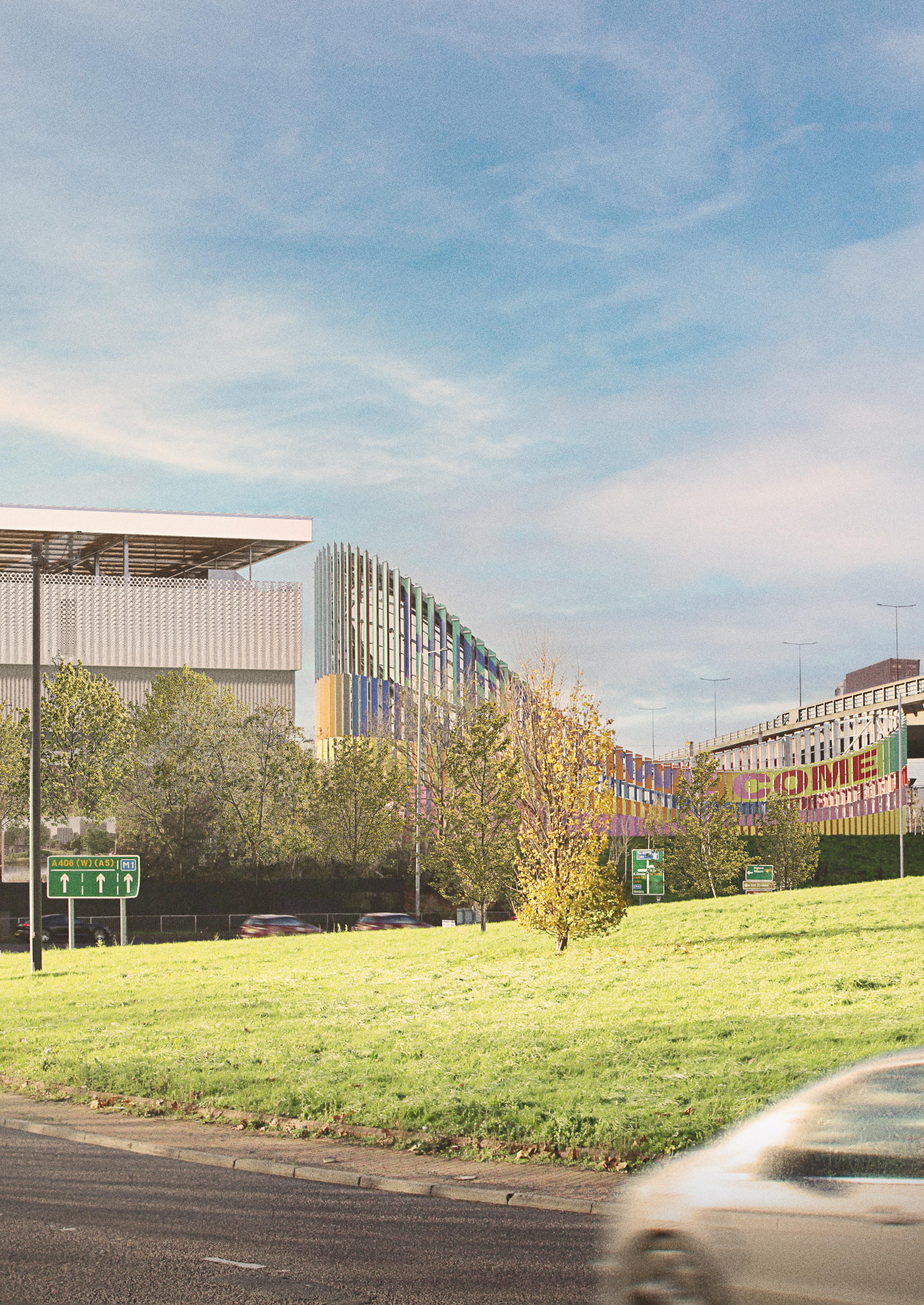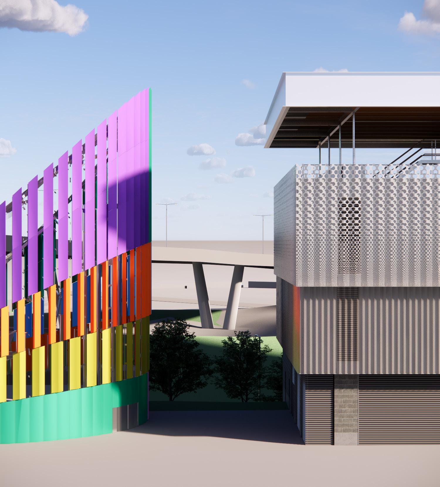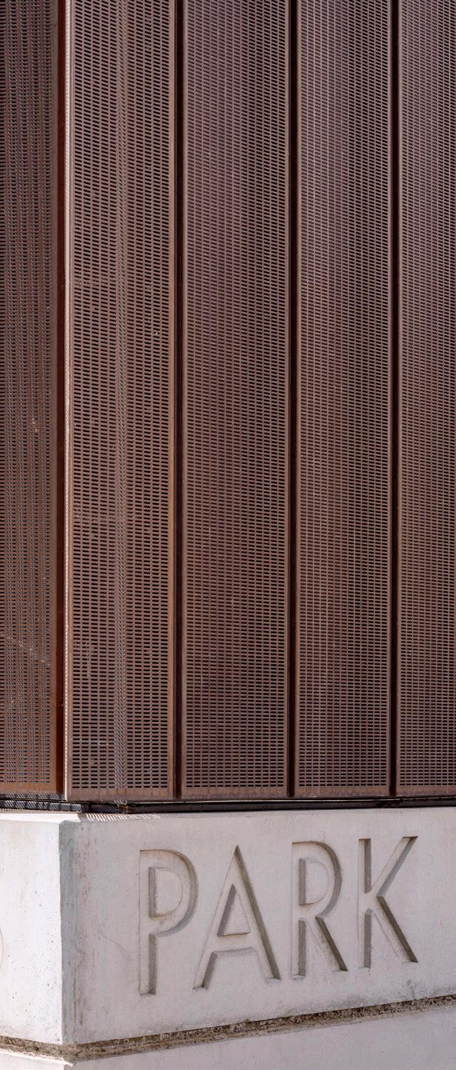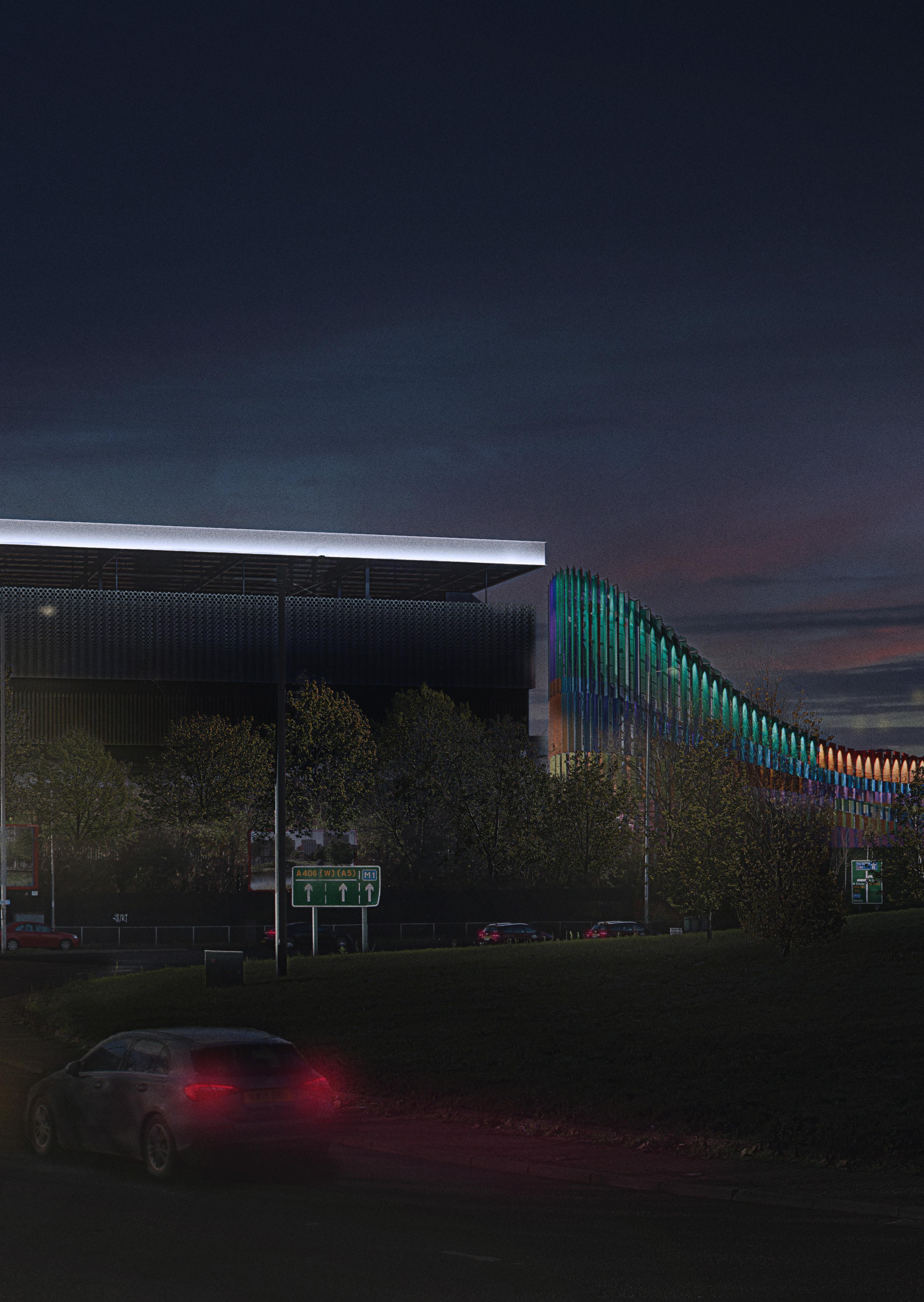 The design is driven by function, yet responds to the visibility of its prominent location. The building comprises a threestorey enclosure with a floating fan deck at roof level. Robust concrete at ground level roots the building within its context, while upper levels are clad in reflective perforated aluminium, expressing the building’s technical complexity in a refined and contemporary manner. The form and material palette carefully complement the adjacent substation and future developments in the Station Quarter.
