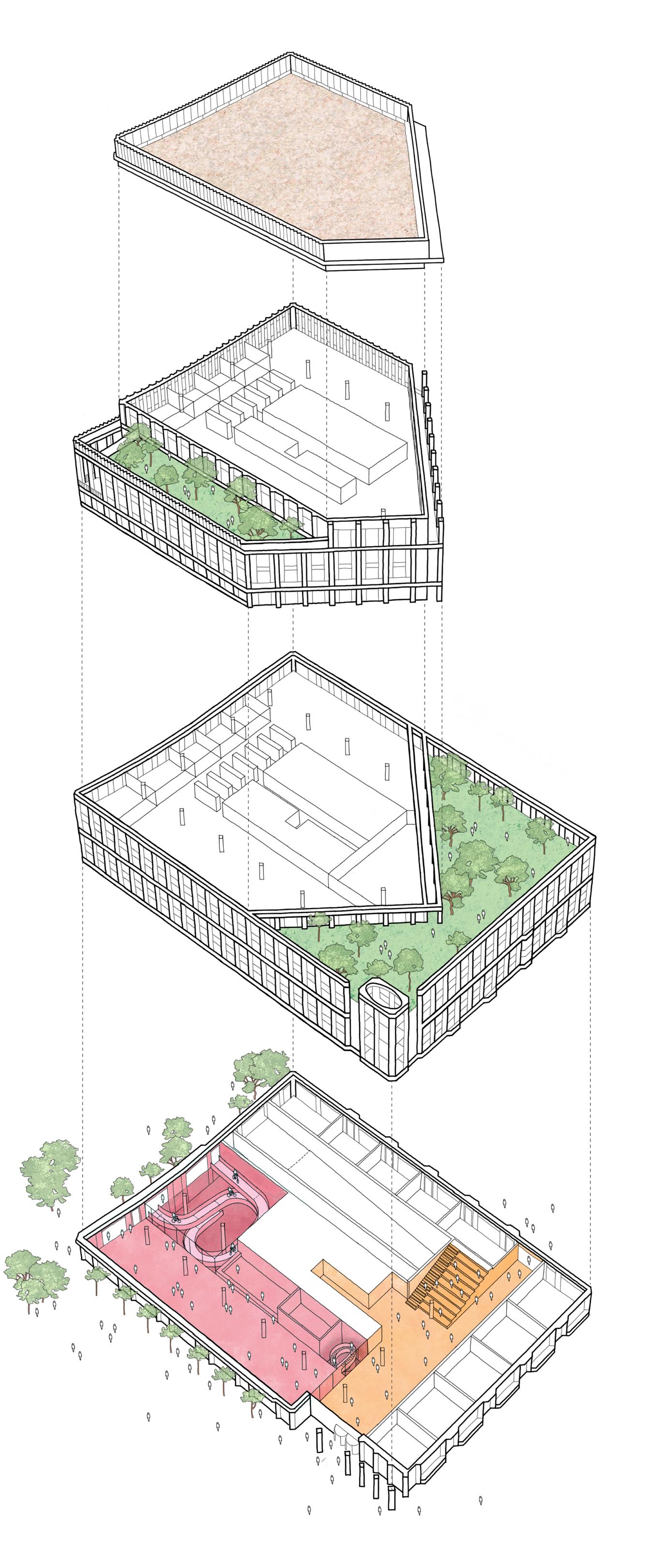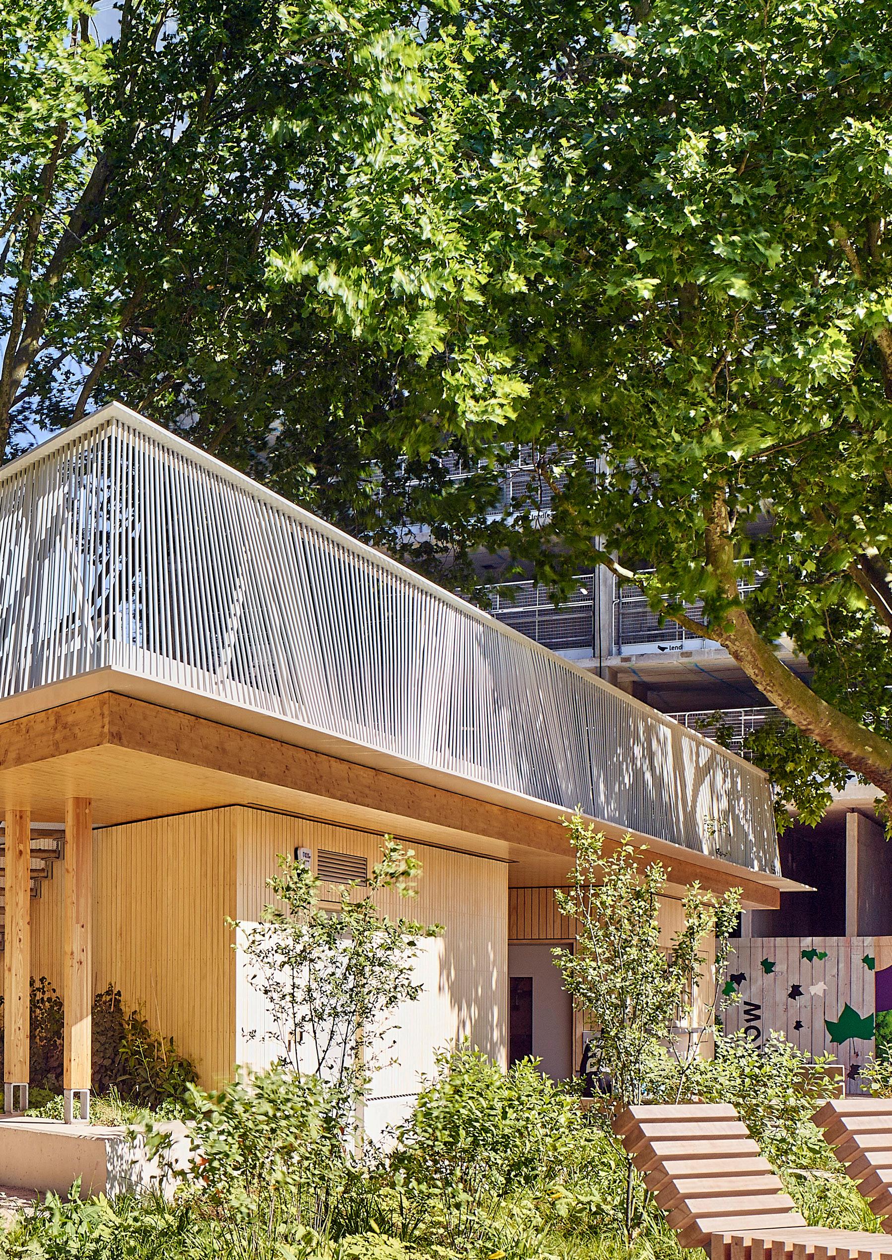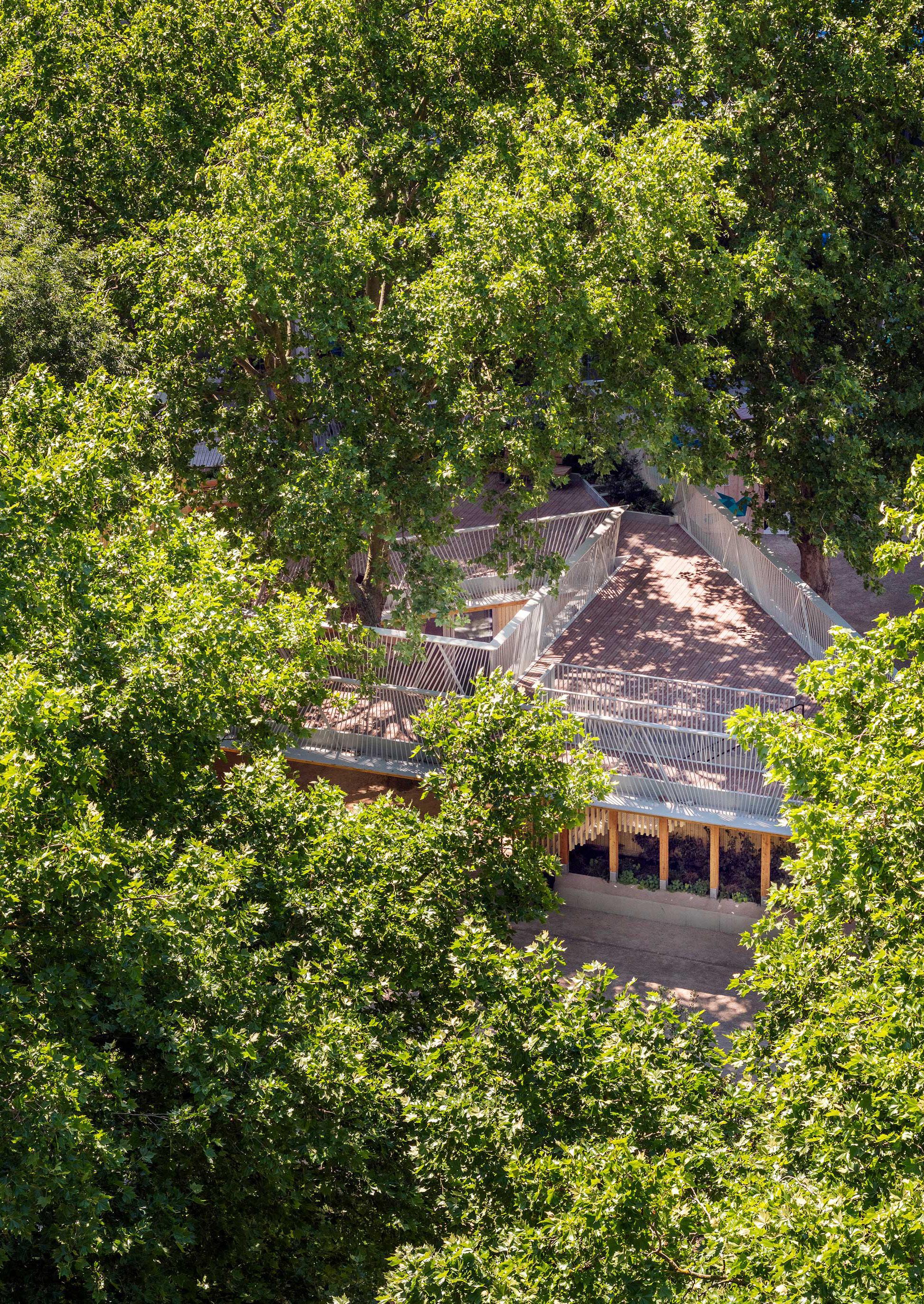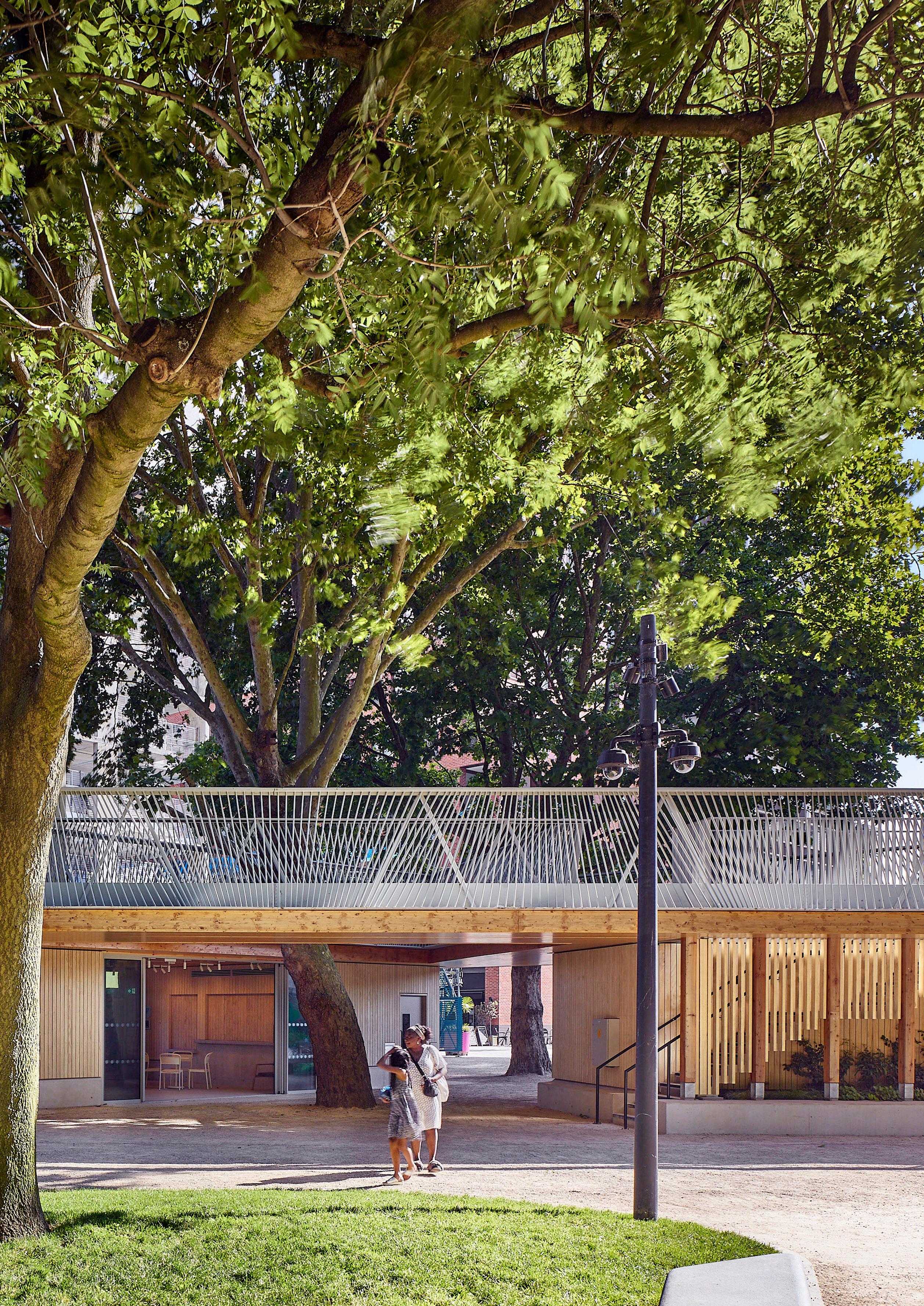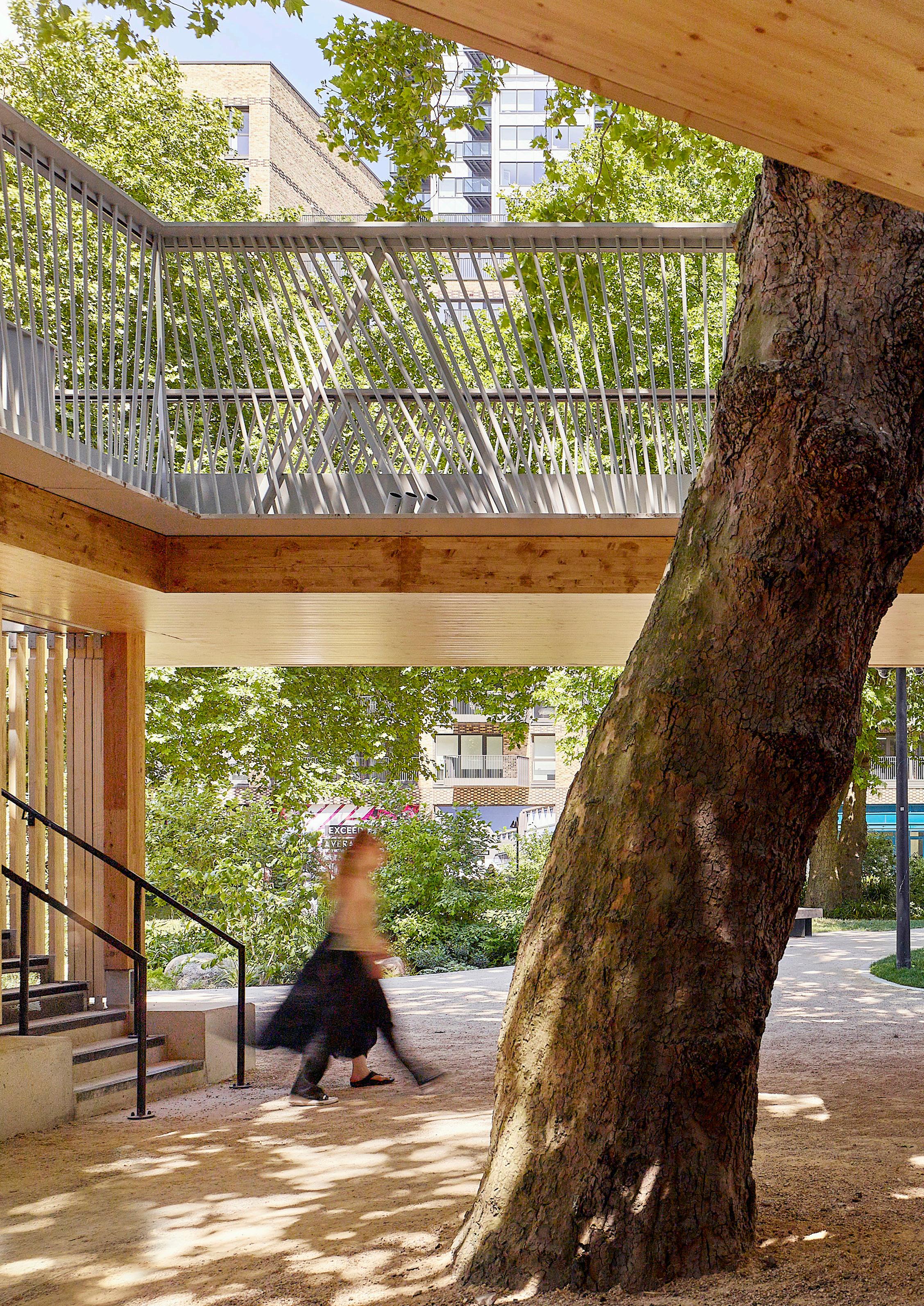 The triangular pavilion is formed by three volumes bound together by an oversailing roof terrace centred on an existing mature London plane tree afforded the benefits of shade, elevated views across the park, and the opportunity to circulate beneath the tree’s canopy.