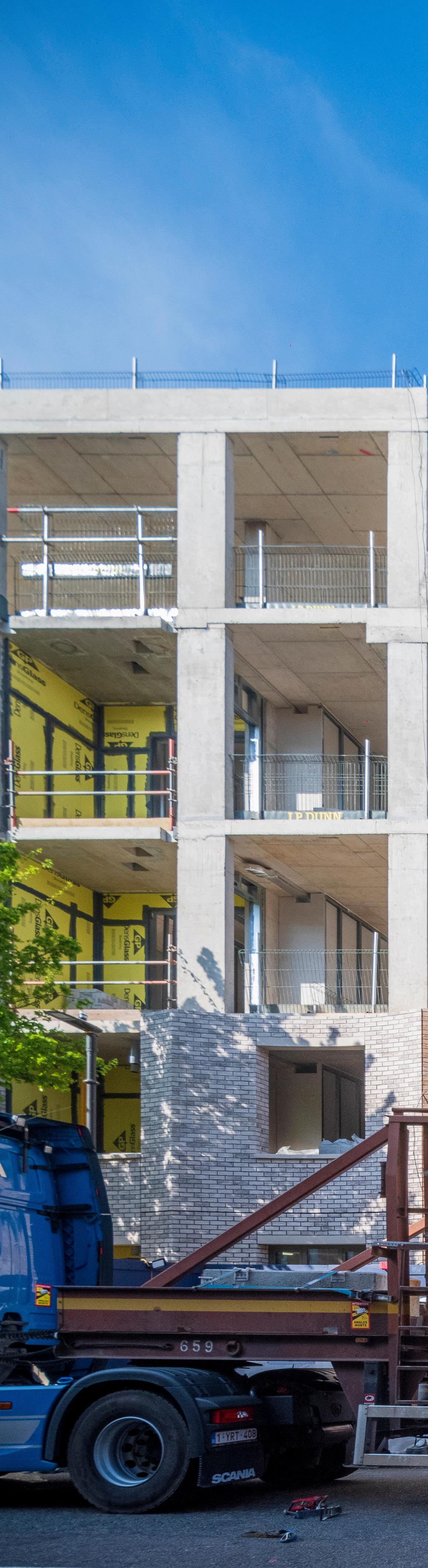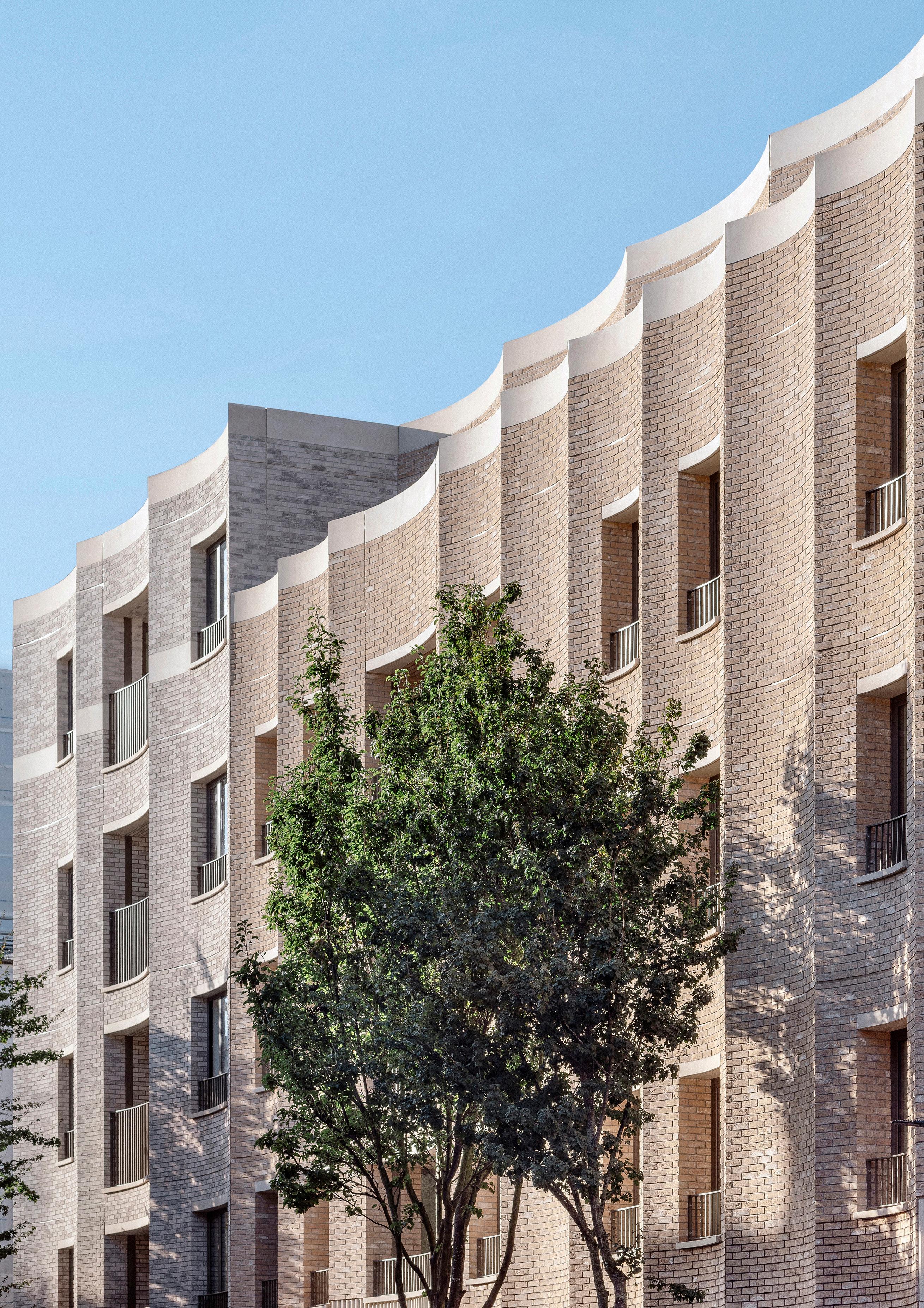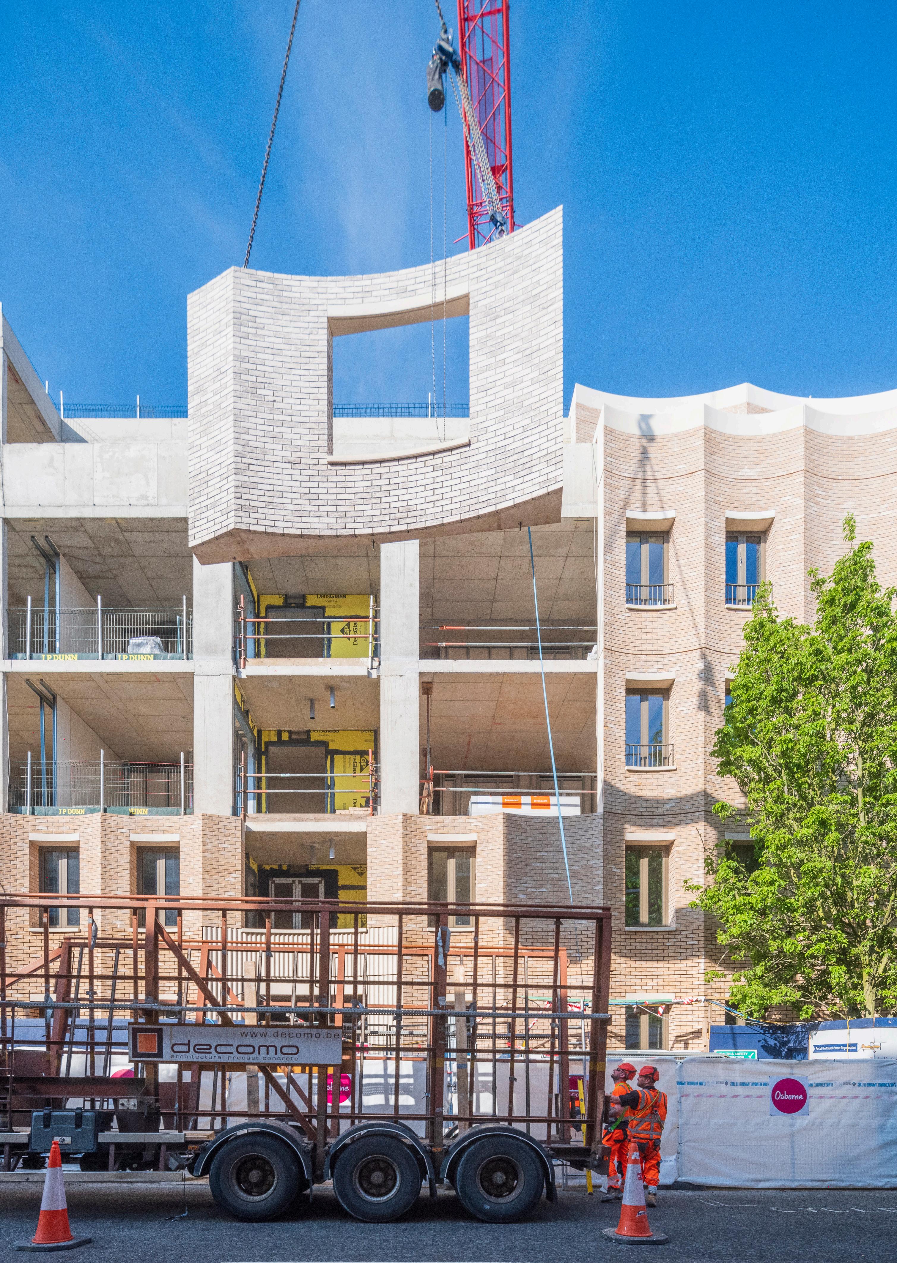The unique scalloped façade was achieved using modern methods of construction (MMC) with brick-clad precast concrete panels. Windows were pre-fitted to the panels in the factory, saving time on site whilst providing increased quality assurance. Eight panels were delivered to site daily from the factory and craned into place. The meticulous coordination between the design team and fabricator avoided recalls, with the entire façade completing in just 8 weeks.
