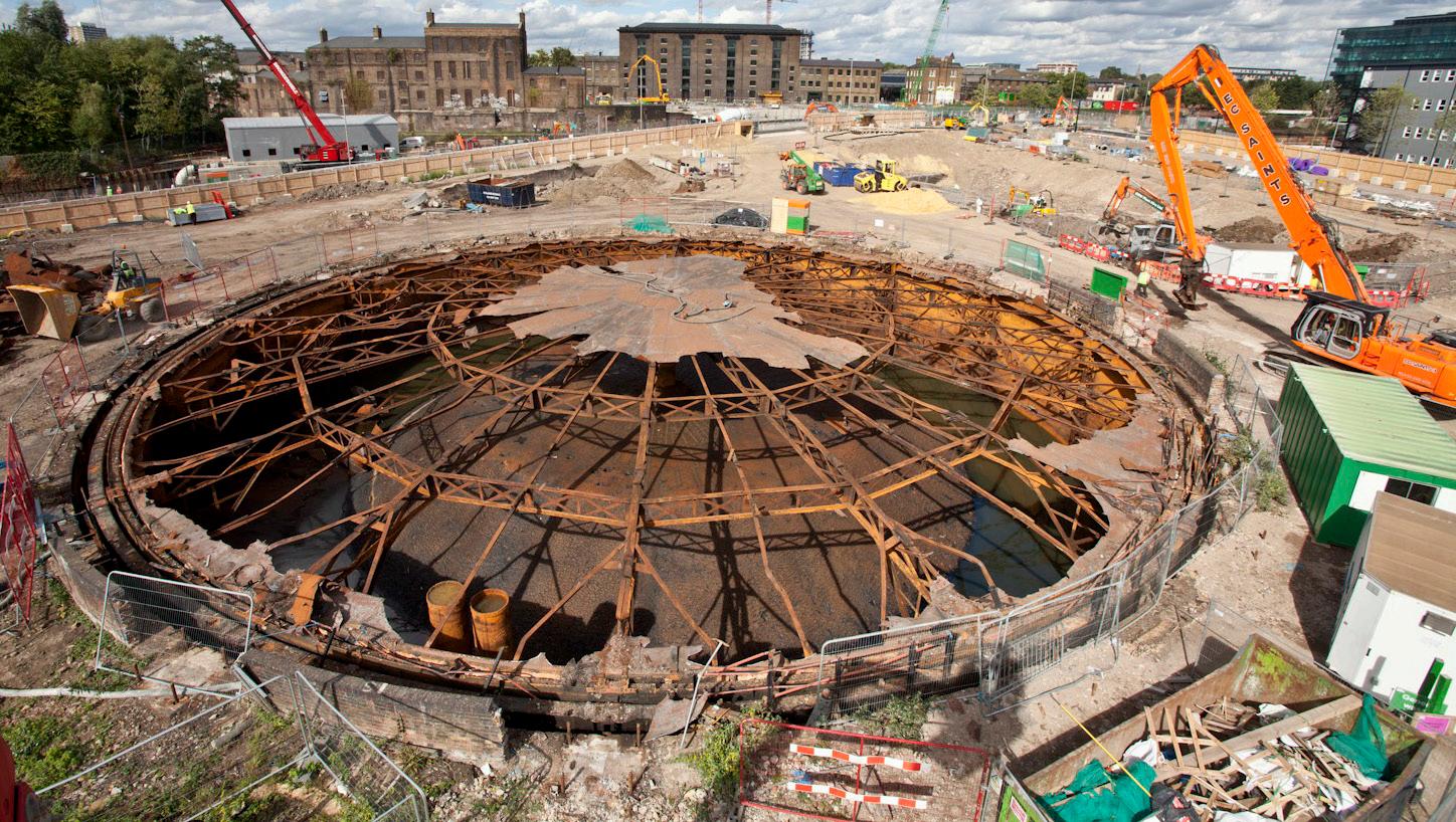 Gasholder No.8 is a Victorian gasholder, constructed during the 1850s from cast and wrought iron, that was once one of 23 gasometers that dominated the King’s Cross skyline as part of the Pancras Gasworks. The gasholder was decommissioned in 2000 and subsequently listed.