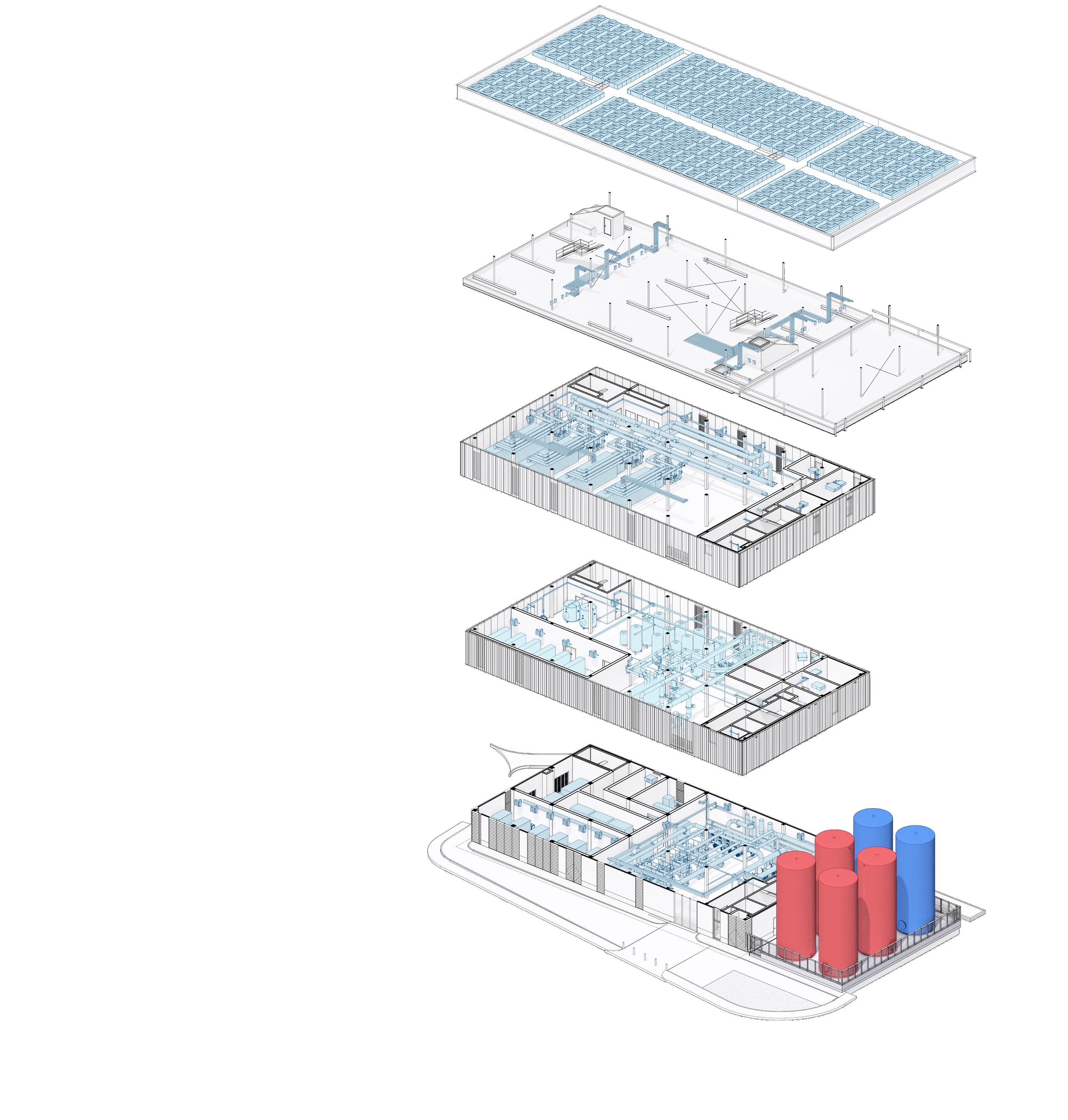 Ground: E-boilers, District Heating Distribution Pumps, and Electrical Systems