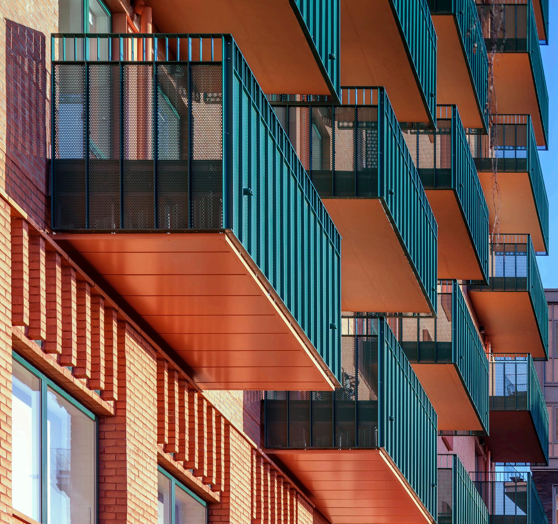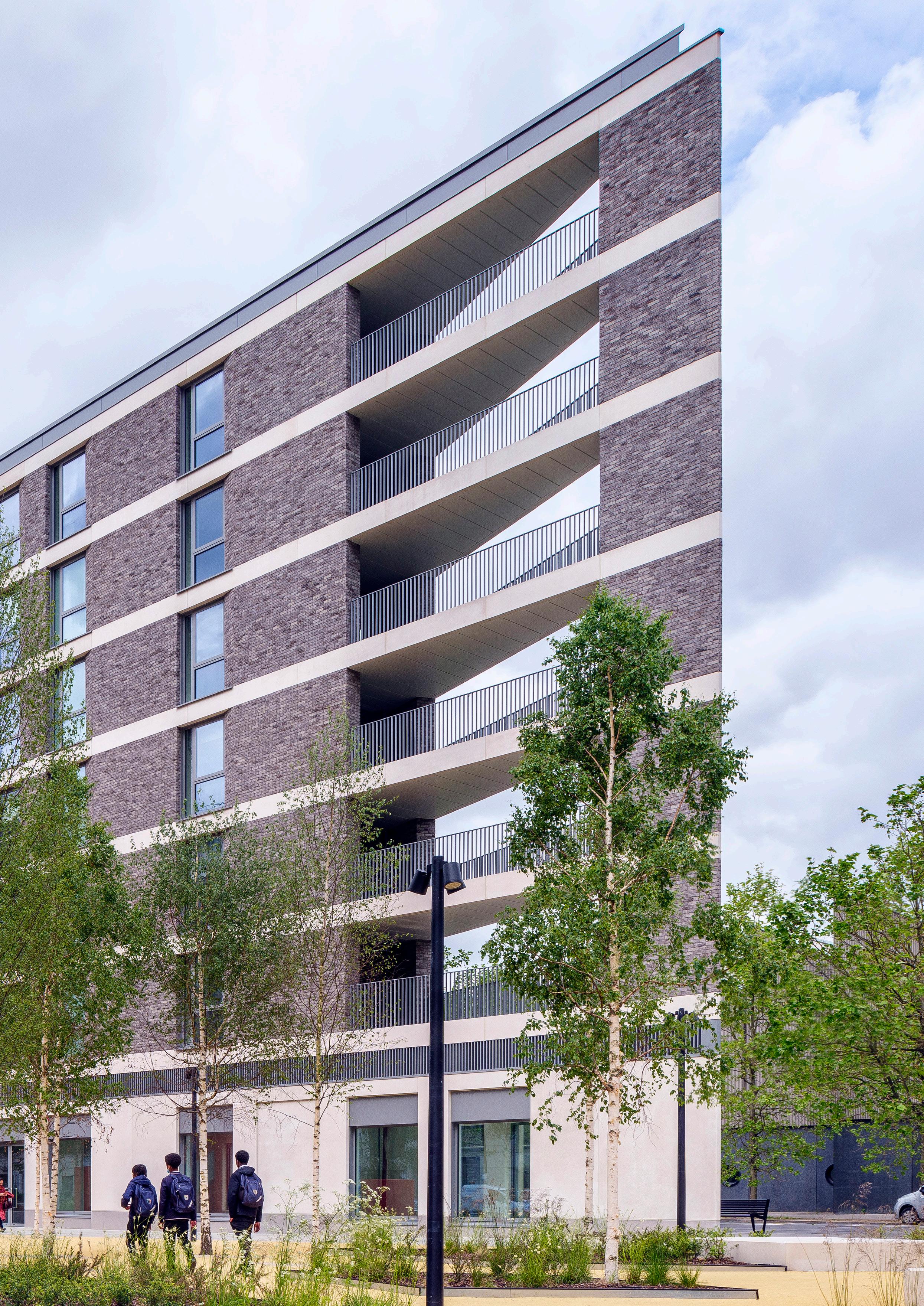 The flats have been arranged to illustrate the following principles: activation of the adjacent public realm, good quality aspect and natural light, outstanding private amenity space, high-quality internal space, and rational and functional layouts. The triple-aspect wheelchair-accessible flats are located at the prominent ‘prow’ of the building with exceptional south-facing balconies offering panoramic views across East Village. A palette of high quality, durable, materials; robust grey brick and cream precast concrete, with generous private balconies mark this building out as an exceptional example of social housing.