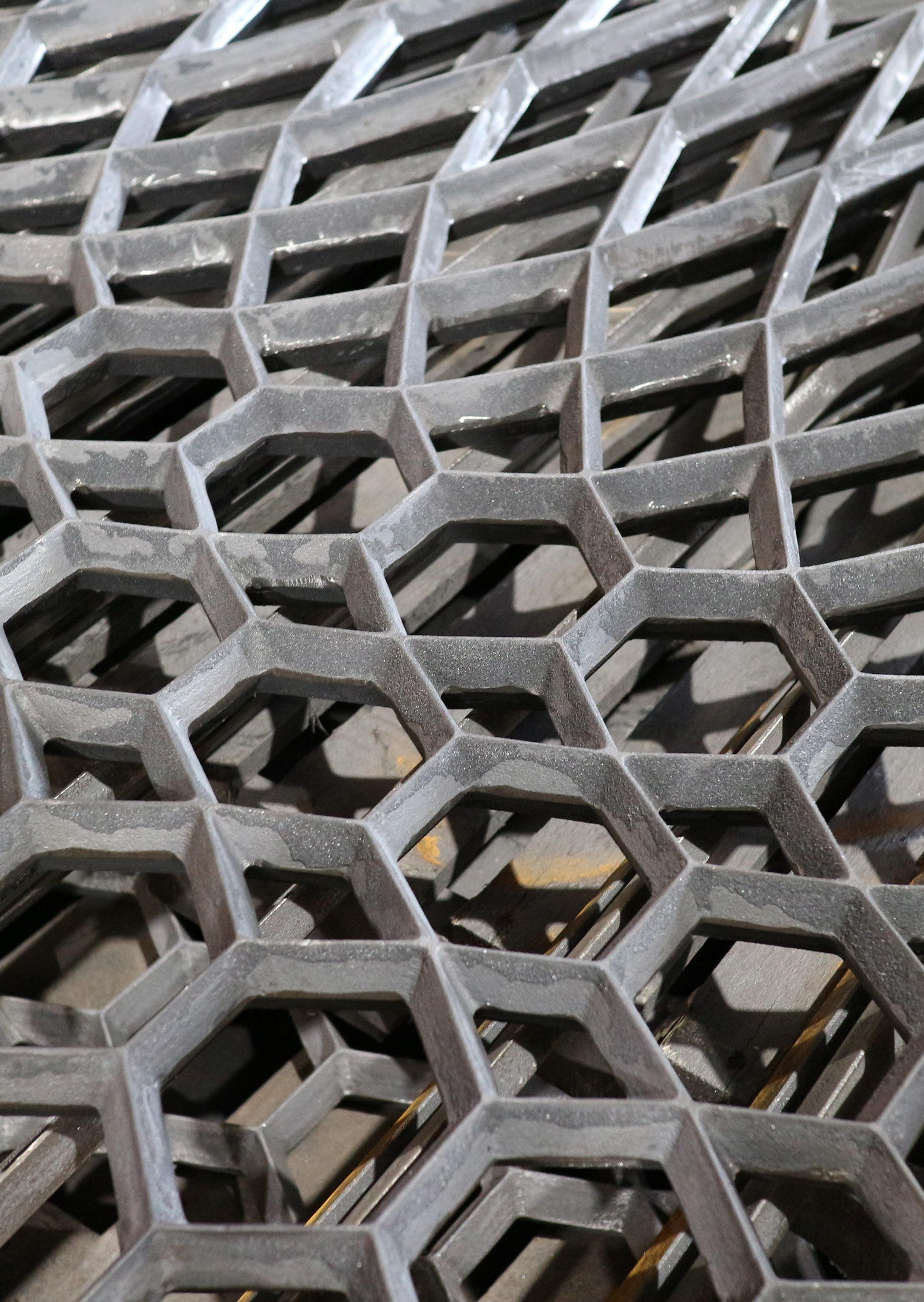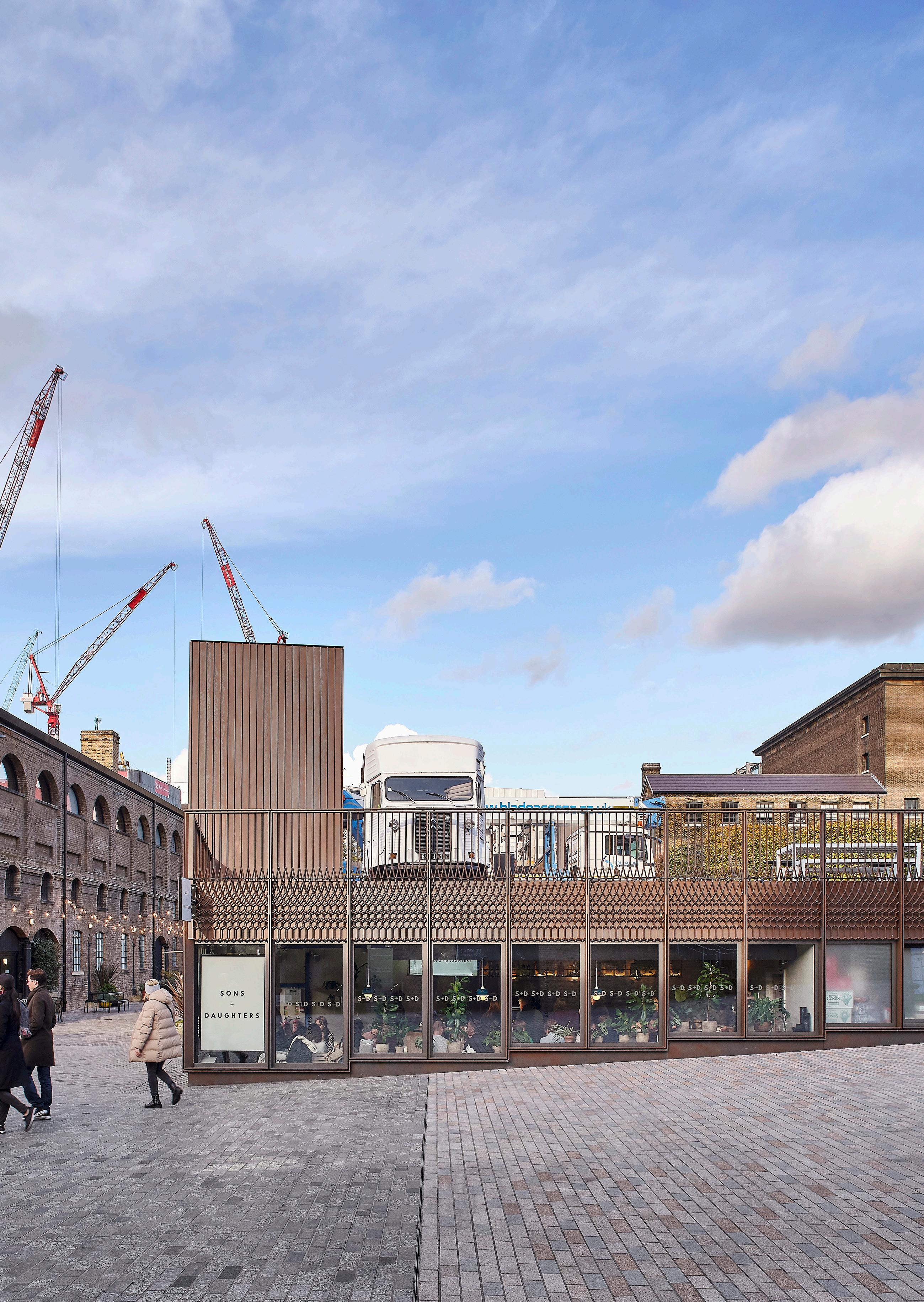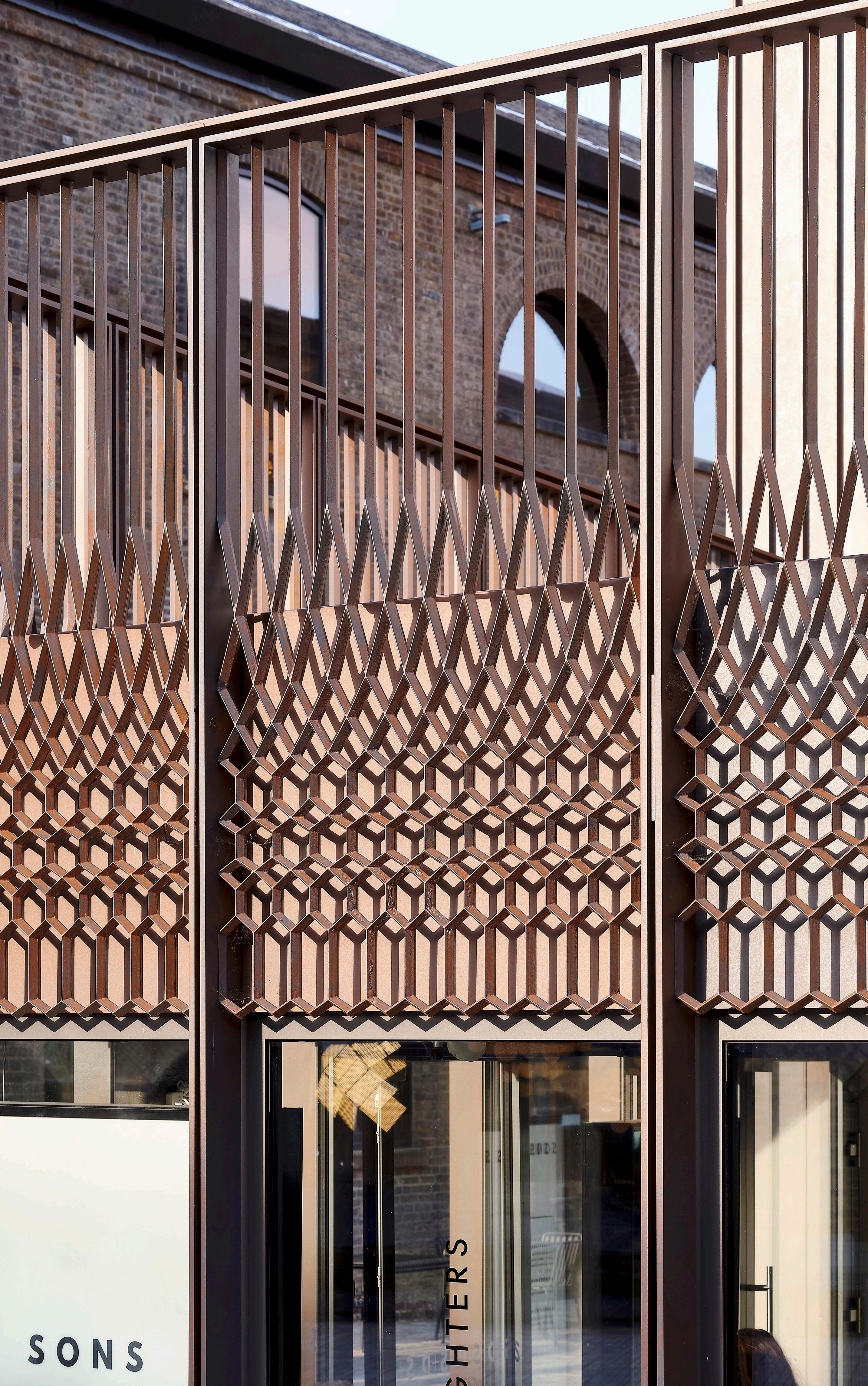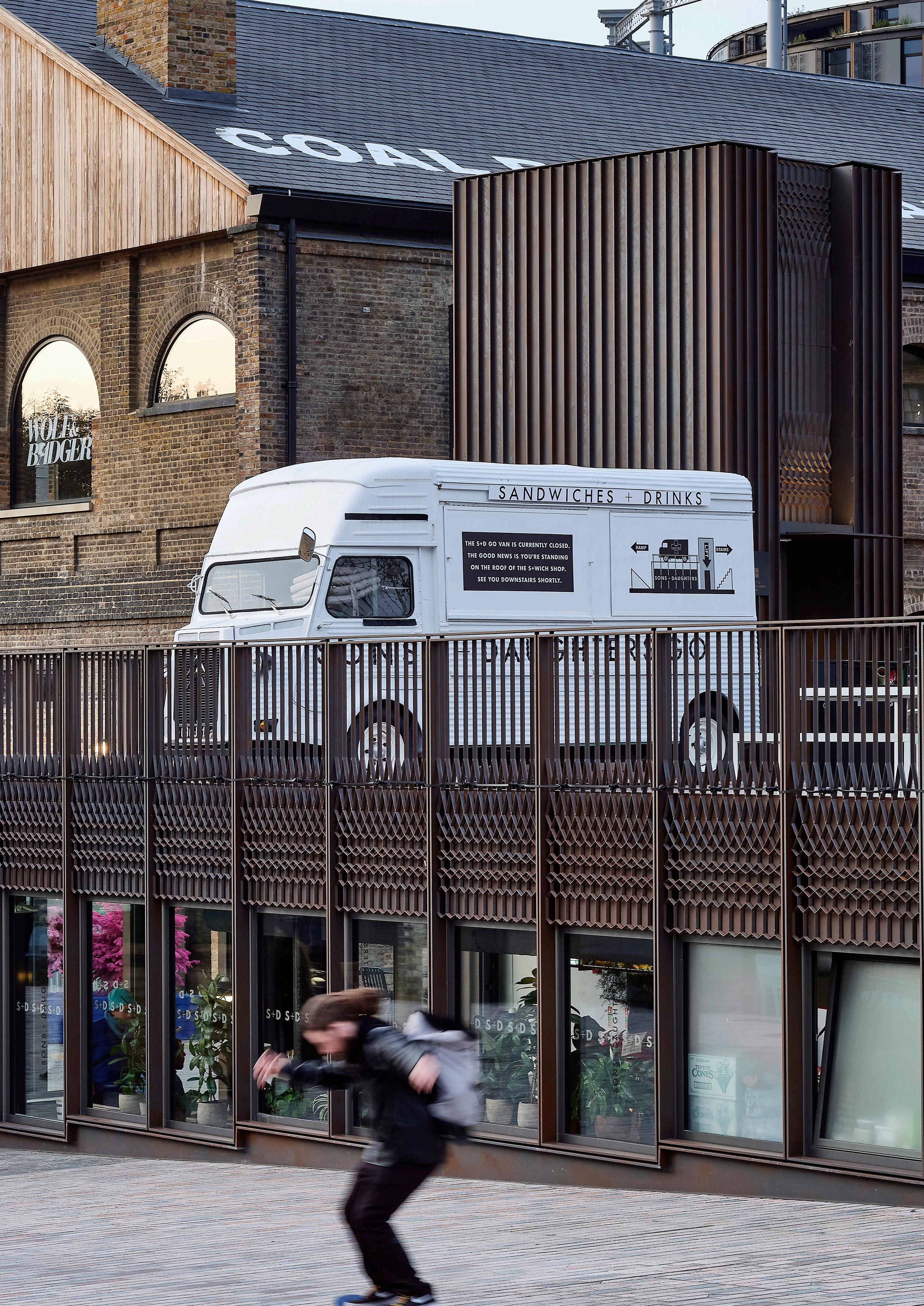 The pavilion has a decorative cast iron façade that extends up to the form a balustrade to Granary Square. The pattern of the cast iron is inspired by the molecular structure of coal referencing the site’s industrial heritage.