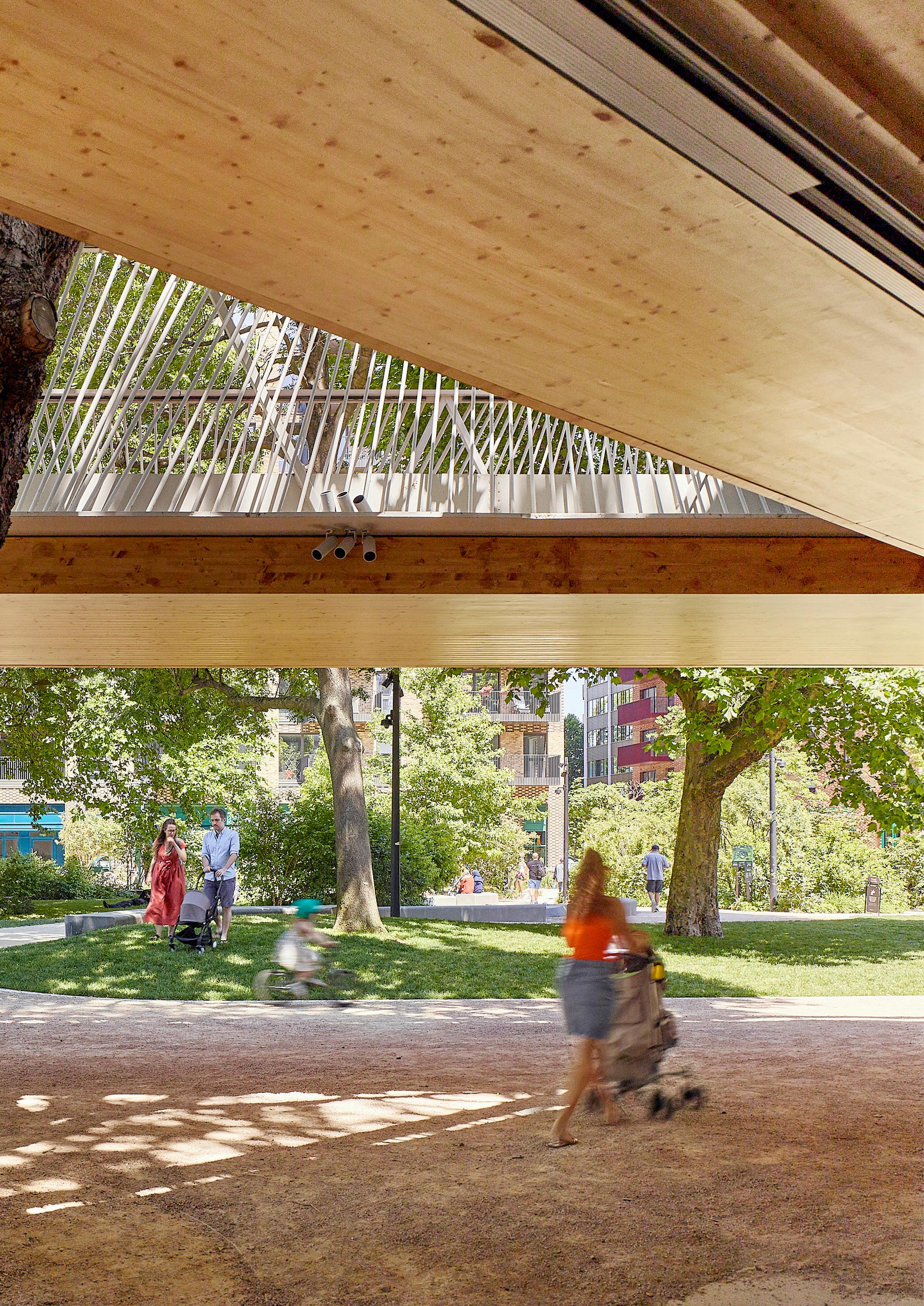 The pavilion is designed to create a seamless flow between park and pavilion, blurring boundaries between inside and outside, enclosure and exposure.