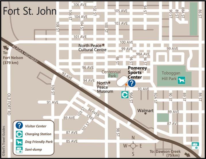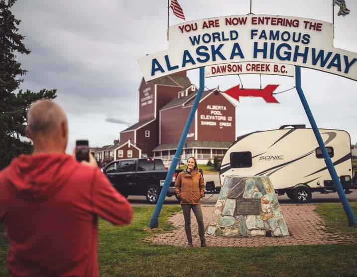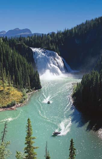 one of the area’s most famous attractions is k inuseo Falls in Monkman Provincial Park. the falls are spectacular, and at 70 metres/230 ft. they are taller than niagara Falls. they are located 60 km south of tumbler ridge, 48 km of which is on a gravel forest service road. Monkman Provincial Park has 20 dry campsites and a day-use area, just 3 km from kinuseo Falls. to continue to Dawson Creek from tumbler ridge drive 96 km on Highway 52 north. At the Hart Hwy, turn right (east) and drive 13 km to reach Dawson Creek. Highway 29 also continues north from Chetwynd. it stretches 137 km, passing through Hudson’s Hope and connecting with the Alaska Hwy, north of Ft. st. John. Moberly Provincial Park is 25 km northwest of Chetwynd, has 109 campsites, a picnic area, boat launch and sani-dump. there is a 3.5 km access road to reach the park on the shores of Moberly lake.