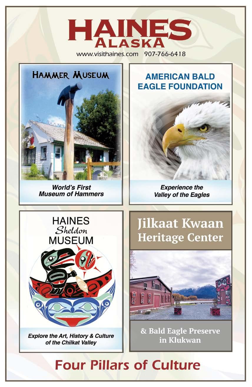 The American Bald Eagle Foundation is a one of a kind nature center in the heart of Haines. t he natural history museum collection consists of more than 200 specimens, representing s outheast Alaska’s natural, geological, and cultural history. outside in the raptor center, guests get up close and personal with eagles, hawks, owls, and falcons. 113 Haines Highway. 907-766-3094