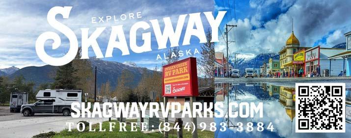 Dyea Campground is operated by the national Park service, 9 miles from skagway. 22 sites for small rV’s and tents. Picnic tables, firepits and toilets are available, but no hookups for r V’s. t he Chilkoot trialhead is only 0.5 miles from the campground. 907-983-2921