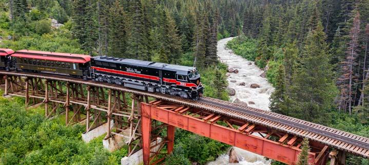 the White Pass & Yukon train crosses a trestle bridge on the famous White Pass