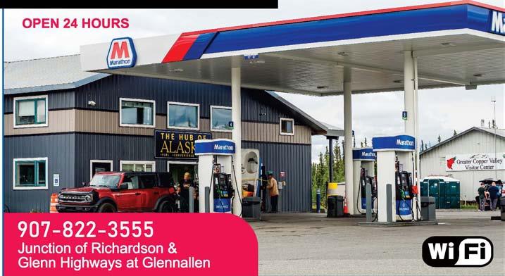 Hub of Alaska at the junction of Glenn and richardson Highways has Marathon gas and diesel. t he Hub store carries a good selection of groceries, gifts, fishing tackle & licenses and they have an AtM. there is also a food truck, espresso drive through and a small restaurant located at the Hub. 907-822-3555