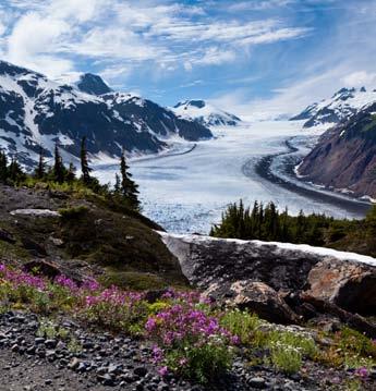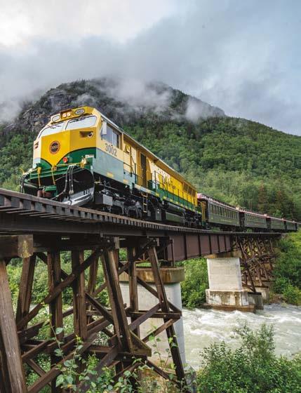 The White Pass & Yukon Route “ t he scenic railway of the World” on the trail of ’98. travel across the White Pass on a narrow-gauge railway that parallels the trail followed by the gold seekers in 1898. in the first 20 miles the diesel-powered train climbs from sea level to 3,000 feet passing Bridal Veil Falls, Dead Horse Gulch and inspiration Point. this can’t miss journey takes guests past mountains, glaciers, waterfalls and historic sites. travelers are sure to enjoy the spectacular views and historic commentary from the comfort of the vintage passenger coaches. the White Pass & Yukon railway recently marked its 125th anniversary. t he train runs daily from May - sept and is handicap accessible. the White Pass train excursion is the most popular tour in Alaska, so be sure to call ahead for reservations. 800-343-7373