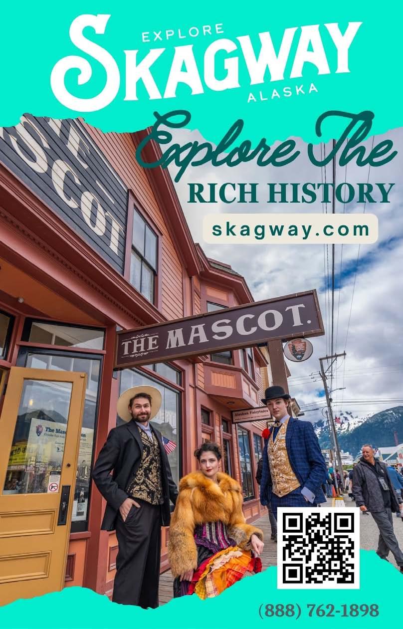 The Days of ’98 Show has been a skagway tradition for more than 100 years. t his hour long live show transports audiences to the gold rush era where swindlers reigned supreme and stampeders whooped it up with can-can girls in rowdy dancehalls. show-goers witness the rise and demise of the king of all con men, Jefferson “soapy” smith. located in the Historic eagles Hall at 6th & Broadway. 907-983-2545.