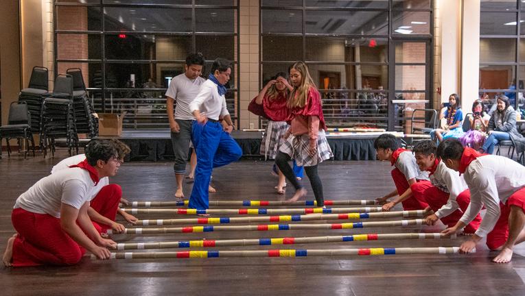 Tinikling is a traditional Philippine folk dance which originated during the Spanish colonial era. The dance involves at least two people beating, tapping, and sliding bamboo poles on the ground and against each other in coordination with one or more dancers who step over and in between the poles in a dance