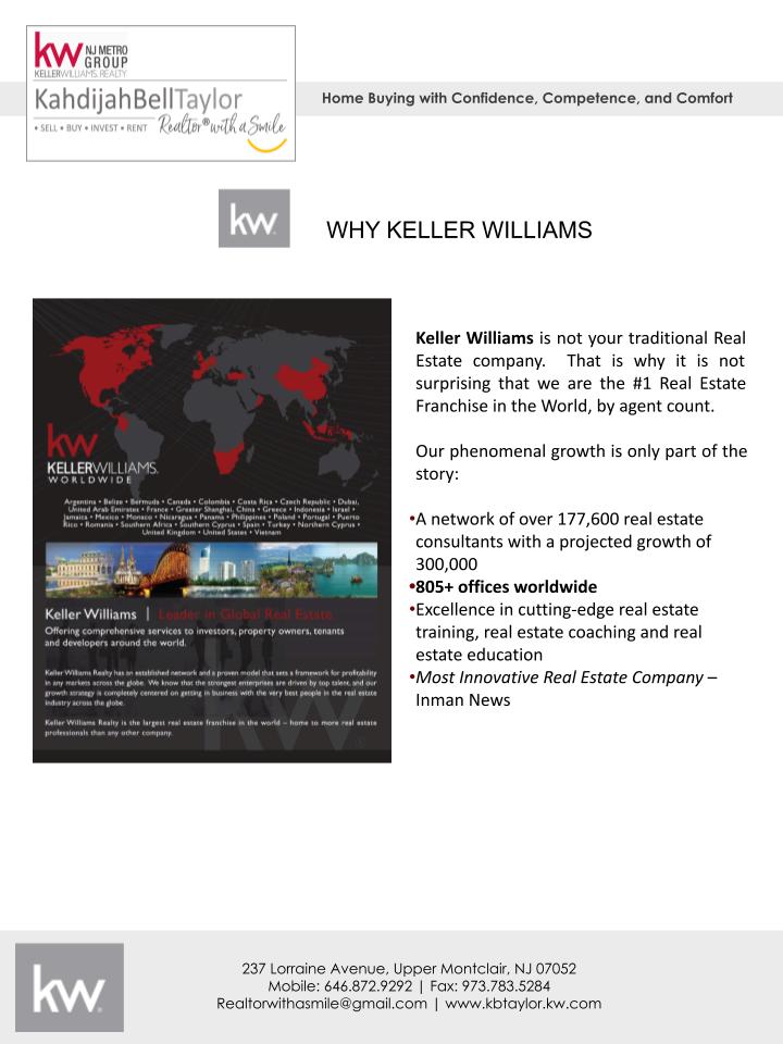 Kahdijah Bell Taylor has built a solid reputation for providing clients with the professional and personal services they deserve. Her in-depth knowledge of New Jersey as well as local real estate markets within the state has led to closing deals with clients in 10 New Jersey counties – Essex, Union, Bergen, Passaic, Hudson, Morris, Middlesex, Somerset, Camden, and Burlington. She has built her real estate services on three key pillars – the 3 C’sCompetence, Confidence, and Comfort: