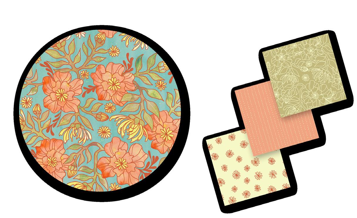 This floral pattern set was created to be used on a variety of products. The set includes one main floral pattern and three coordinates to compliment it. Below, I have mocked up ways this pattern and coordinates can be used together or separately, displaying its diverse usability.