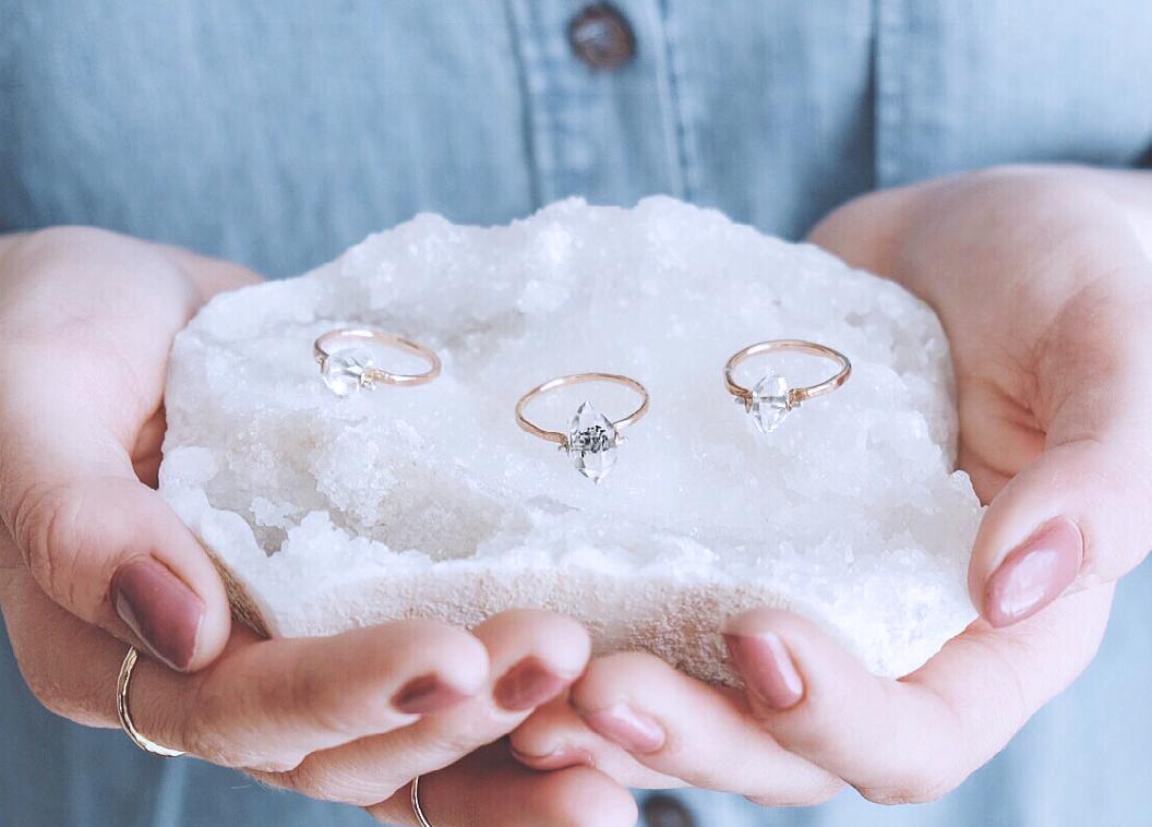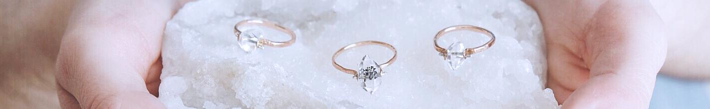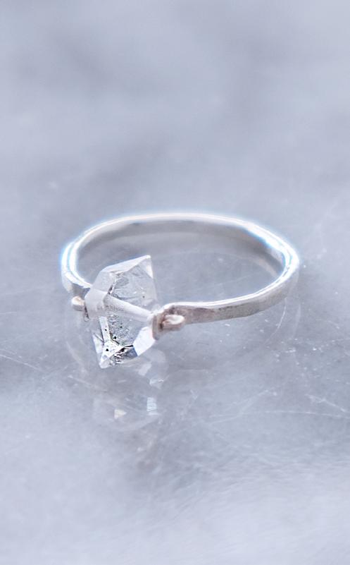 diamonds she suprised us with her perspective, “I have such a deep love for the Herkimer stone. I was so tired of the same diamond cut gems and I longed for something that is closer connected with nature. The frst second I saw a raw Herkimer I was in love. There’s something so inspiring about the fact that it comes out of the earth, so brilliant and raw. I wanted to create a design that honored the integrity of the stone itself not weighting it down with thick prongs or bars, just a simple band with a simple stone. I love the idea of wearing a piece of nature, carrying a little bit of creation itself with you always. “
