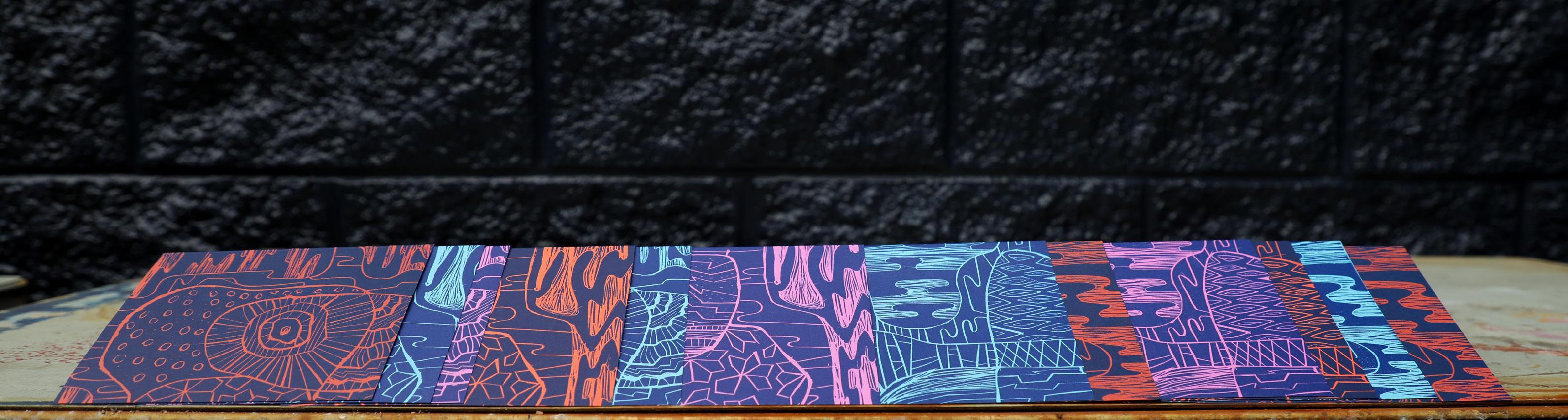 A set of blank cards designed with abstract shapes and lines inspired by carving my first linocut.