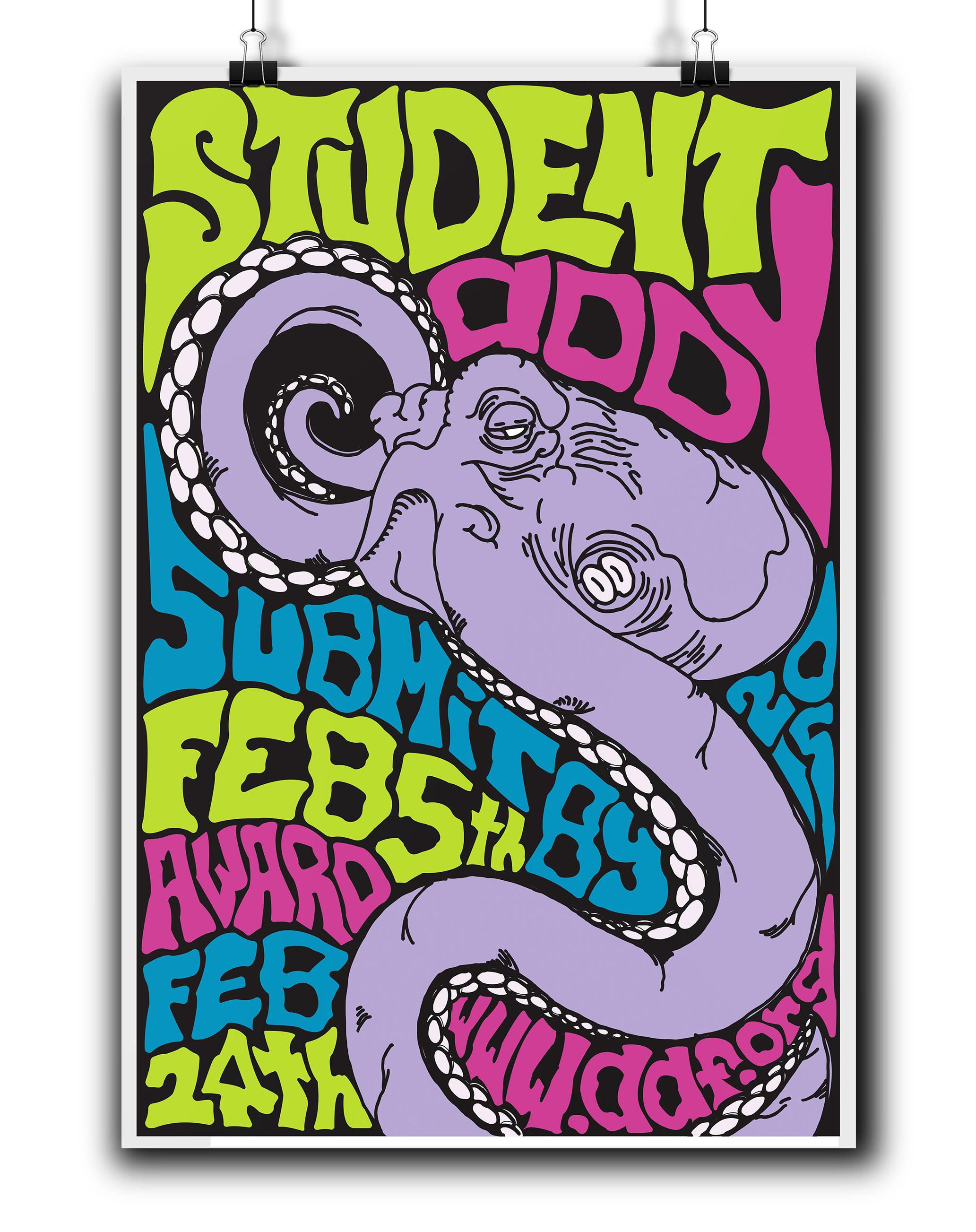 The aim of the project was to create a fictional poster for the 2015 Student Addy Awards. After researching popular art movements, I decided to create a poster representing the style of the psychedelic movement. The main principle of the psychedelic movement was not to deliver a message instantly but to rather leave the viewer engaged for as long as possible.