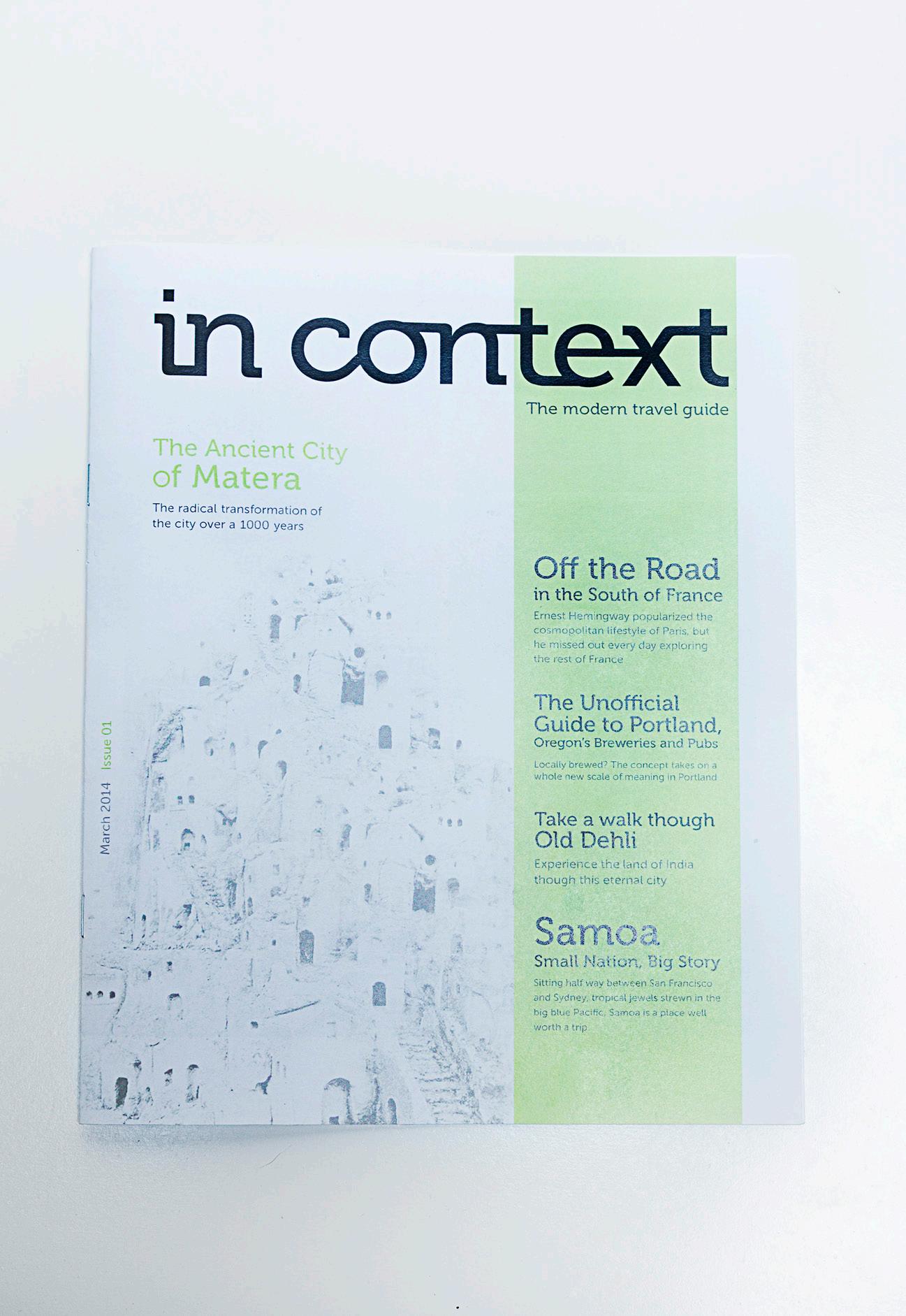 This editorial design project was a great way to delve into the world of magazine publication and to feed my need to explore new places, even if it was through a computer. When the assignment to create a magazine was given I knew what I wanted to do. A clean, modern, and content-rich magazine that the cultural traveler could enjoy. The copy and titles where kept bright but secondary to the wonderful imagery of places across the globe. In Context magazine is quite different from many travel magazines that anyone would encounter, for a purpose. Magazine shelves are bursting with bright and lush photography that gives away too much at a glance. This magazine was created for those who value the culture and hidden gems of a city or country without cliché photography.
