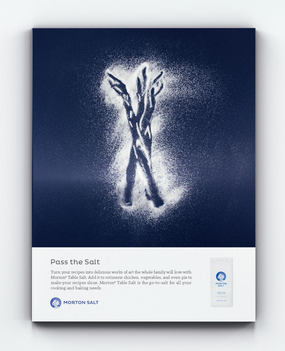 With the new logo modern and refreshed, Morton Salt needed to change its advertising. I chose to stay loyal to tradition by continuing to use the Morton blue with the new packaging. However I decide to contrast the past by creating advertising that is more experimental. The imagery is salt art made by hand and photographed by a colleague.