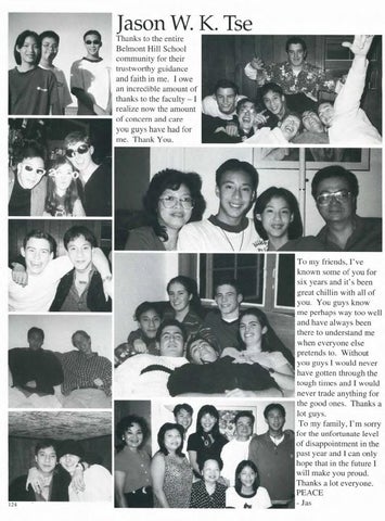 Jason W.K. Tse Thanks to the entire Belmont Hill School community for their trustworthy guidance and faith in me. I owe an incredible amount of thanks to the faculty — I realize now the amount of concern and care you guys have had for me. Thank You.