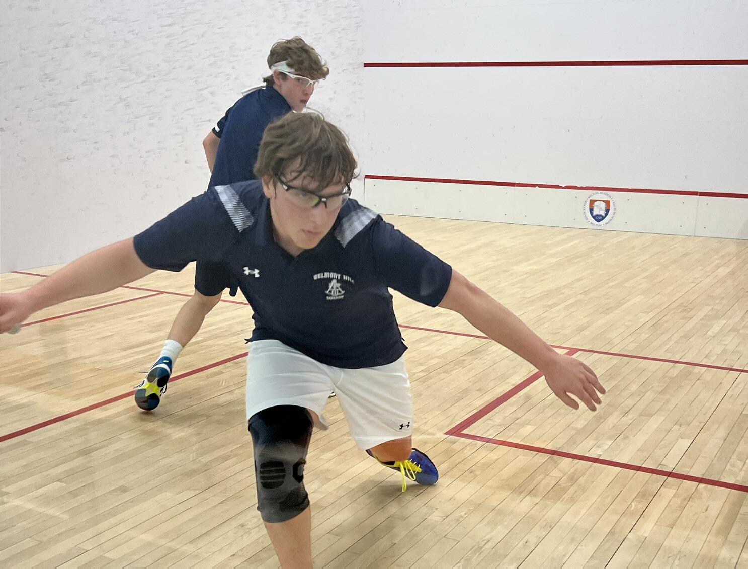 Aaron Green playing squash, and the Varsity Squash team at Nationals