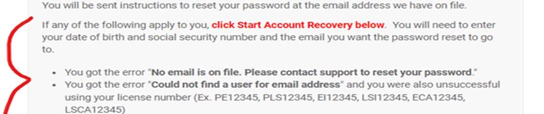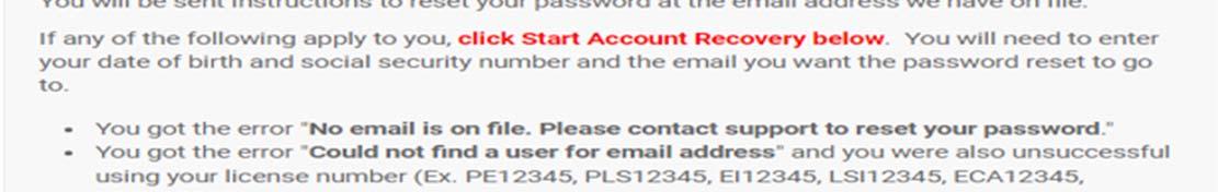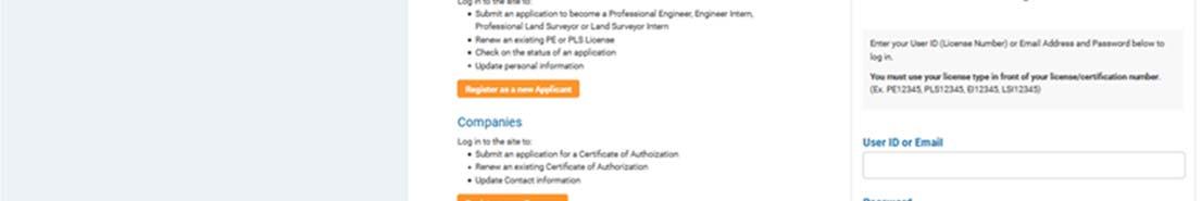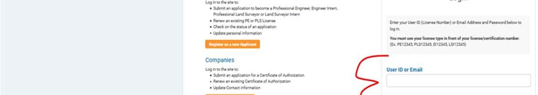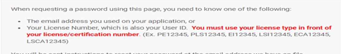 Step 4. Enter your License/Certification number or your email address that we have on file. If you use your License/Certification number, you will need to put the license/certification type in front of the number. Examples: PE12345, PLS12345, EI12345, LSI12345.