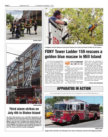 FDNY Tower Ladder 159 rescues a golden blue macaw in Mill Island On July 21st at approximately 12 p.m., FDNY Towerladder 159 was in the Mill Basin section of Brooklyn when they were flagged down by a frantic civilian reporting that her three month old Golden Blue Macaw flew the coop and was now perched in a tree approximately 30 feet off the ground. Tower Ladder 159 immediately sprung into action, raised the bucket and began the rescue attempt. "We were only a foot away" said Firefighter Vincent Sammarco when another much smaller bird perched itself beside the Macaw and spooked him sending Albus to an-