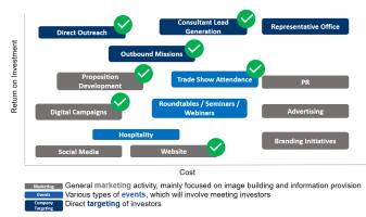 To successfully attract FDI, it is recommended that BELTRAIDE creates a targeted and cohesive marketing strategy. There are a variety of marketing activities that can take place. From the diagram on the right, the marketing activities with a check mark indicate strategic activities BELTRAIDE could consider when implementing the Blue Economy Investment Promotion Strategy