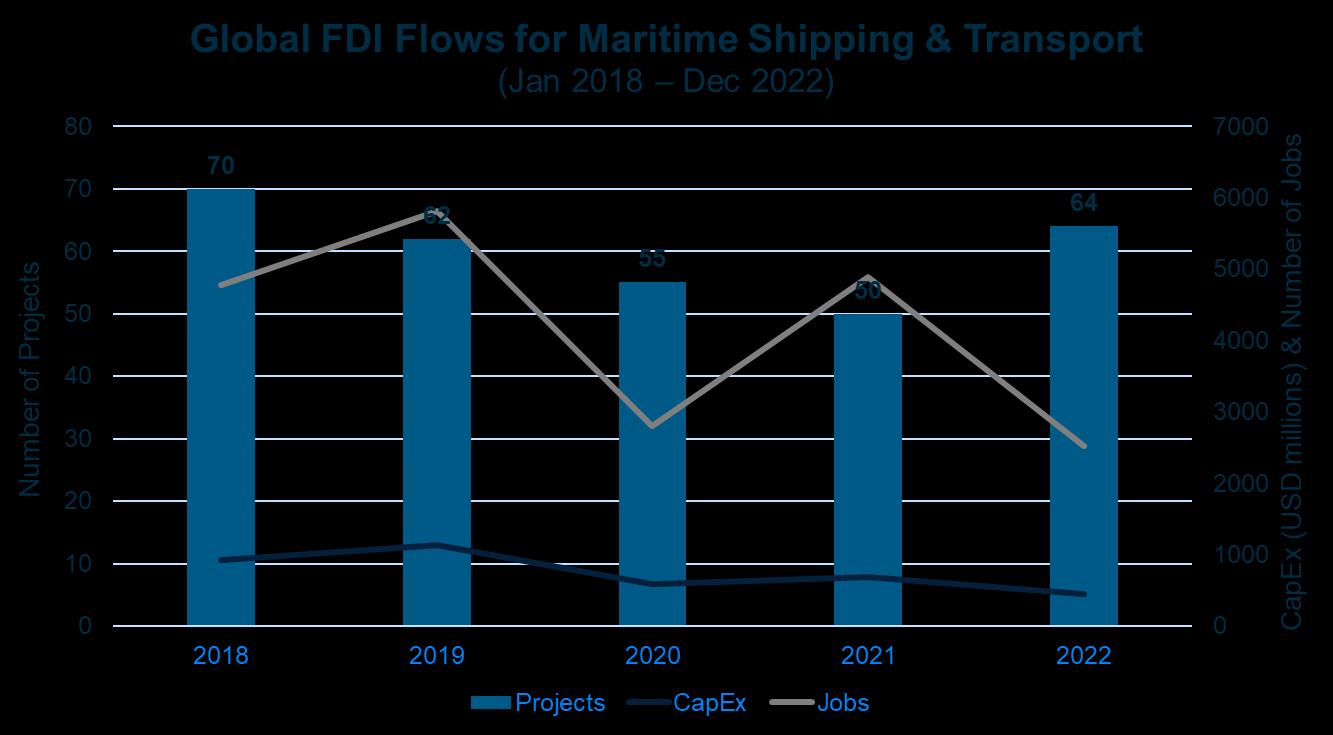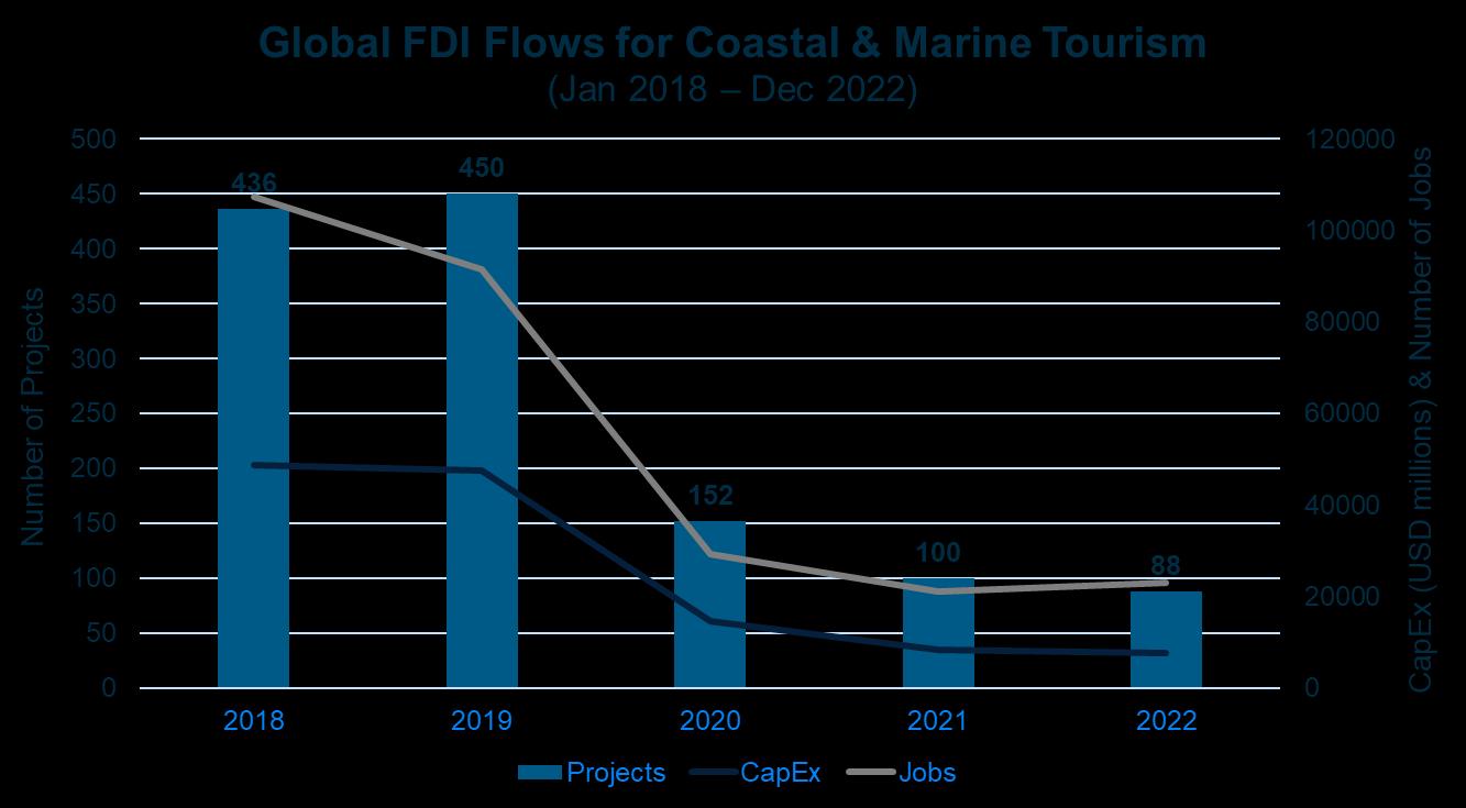 Over the past ten years (between 2013-2023), the Caribbean Association of Investment Promotion Agencies (CAIPA) members, including Belize, attracted a reported 531 FDI projects, resulting in $66 billion capital expenditure (CapEx) and the creation of over 189,000 new jobs.67 Of the 531 projects, 14% were in the Hotels & Tourism sector. Transportation and Warehousing, closely linked with the key sub-sector of Maritime Transport and Shipping, accounted for 6% of all projects. Within these 531 projects, 14 projects went to Belize and 33% of those were in the Blue Economy. A dedicated investment strategy focused on the blue economy could increase Belize’s proportion of incoming projects within the region.