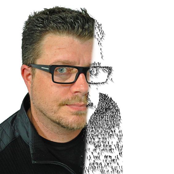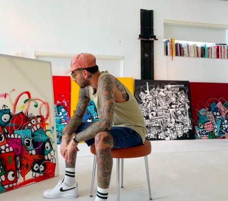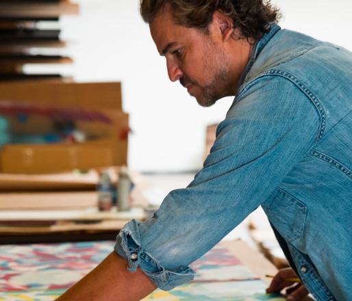 Known for his paintings which align groups of people seen from an aerial perspective, to create reimagined versions of iconic works by Andy Warhol, Keith Haring, Piet Mondrian, and others.