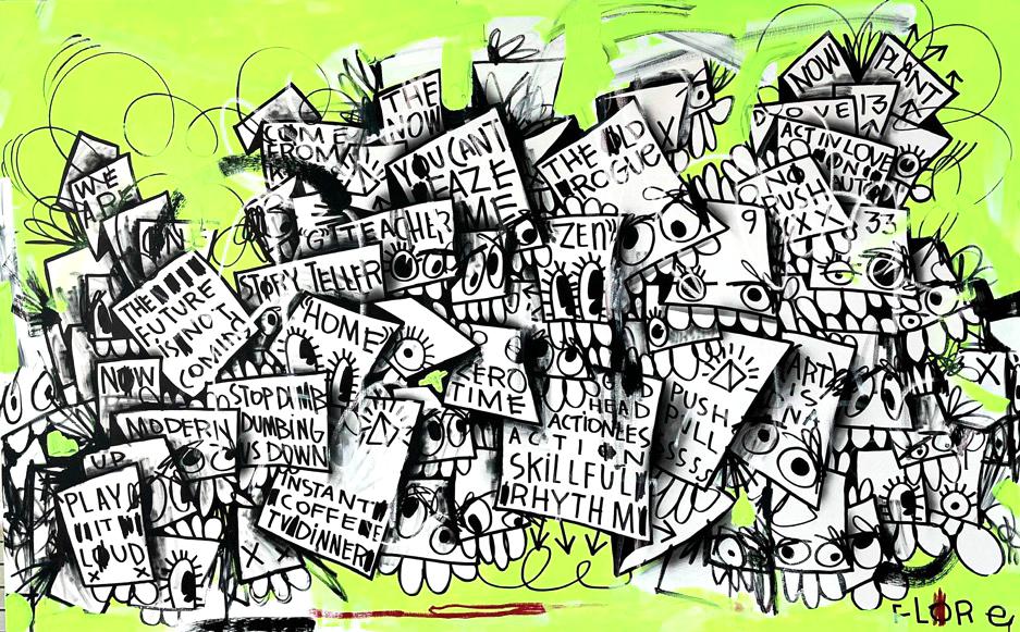 Flore’s passion for painting and love for art history is prevalent in his works, his distinct style merges pop art and street art together. Using written words with layers upon layers of meaning both partially concealed and exposed, the artist attempts to deconstruct and reveal those layers for what they really are.